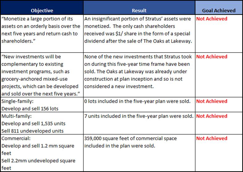 The consequences from the total lack of accountability, oversight and strategy at Stratus are manifold. Perhaps the most staggering example is Stratus’ total failure to execute on the five-year plan it presented to shareholders on April 20, 2015, where it promised to “monetize a large portion of its assets on an orderly basis and return cash to shareholders.”