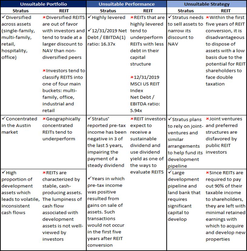 After the expiration of the five-year plan, Stratus refused to develop or disclose a new disposal plan that would return cash to shareholders. Instead, Stratus announced its intent to explore a REIT conversion, which represented a stark departure from its previously communicated strategy, as it effectively halts asset disposals and their potential associated shareholder returns through at least 2027. Furthermore, contrary to the Company’s claims, it is not apparent that a REIT structure will create value for Stratus’ shareholders as Stratus’ portfolio, performance and strategy are precisely the opposite of those preferred by REIT investors, as detailed in the chart below: