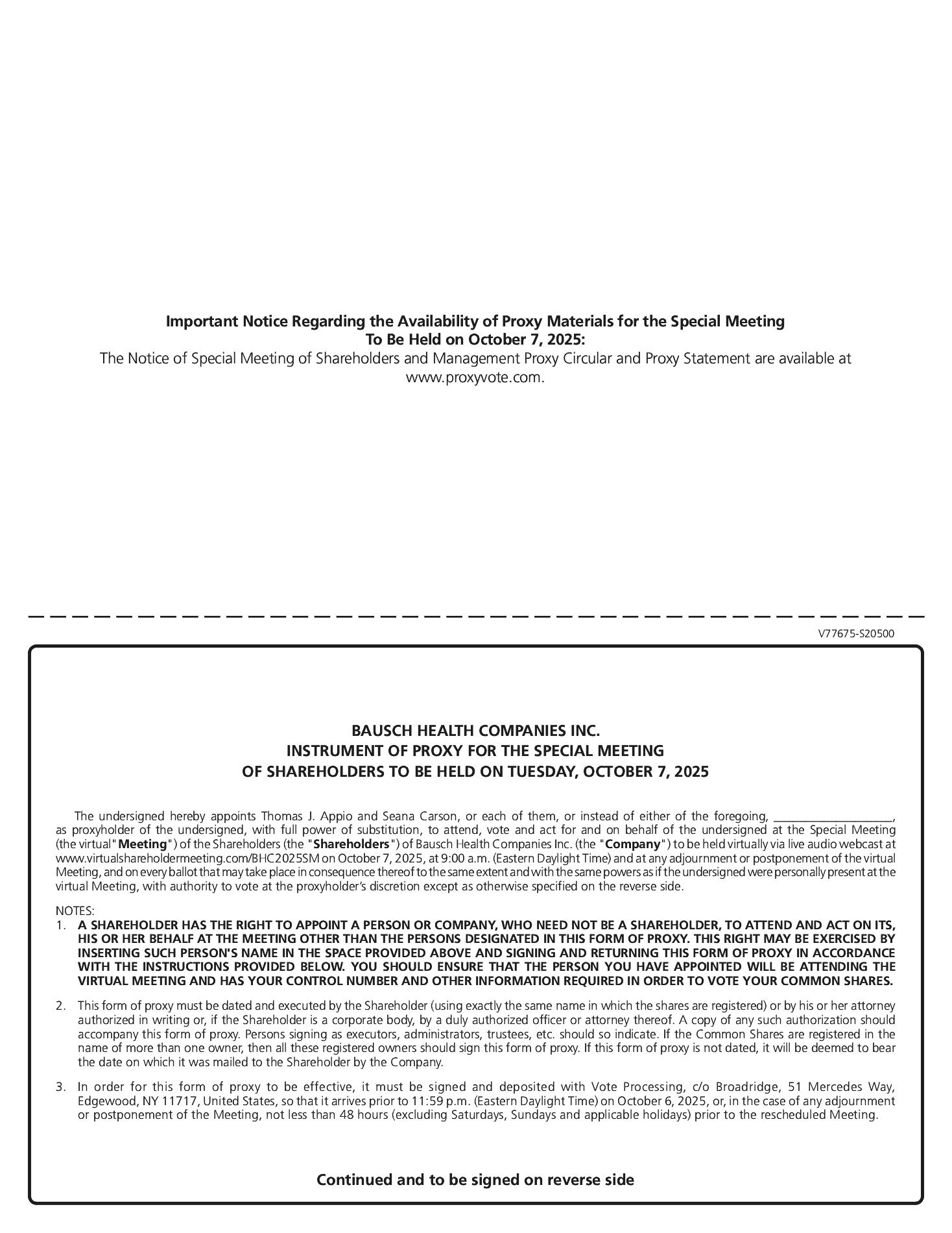 This Management Proxy Circular and Proxy Statement (“Proxy Statement”) contains information about the Special Meeting of Shareholders of Bausch Health Companies Inc., which will be conducted in an exclusively virtual format via a live internet webcast at www.virtualshareholdermeeting.com/BHC2025SM at 9:00 a.m., Eastern Time, on Tuesday, October 7, 2025, and at any adjournments or postponements thereof (the “Special Meeting” or “Meeting”), for the purposes set forth in this Proxy Statement and in the accompanying Notice of Special Meeting of Shareholders. In this document, the words “the Company,” “Bausch Health,” “we,” “our,” “ours,” “us” and similar terms refer only to Bausch Health Companies Inc. and not to any other person or entity. Unless otherwise indicated, the statistical and financial data contained in this Proxy Statement are as of August 27, 2025.