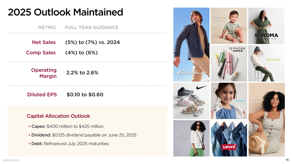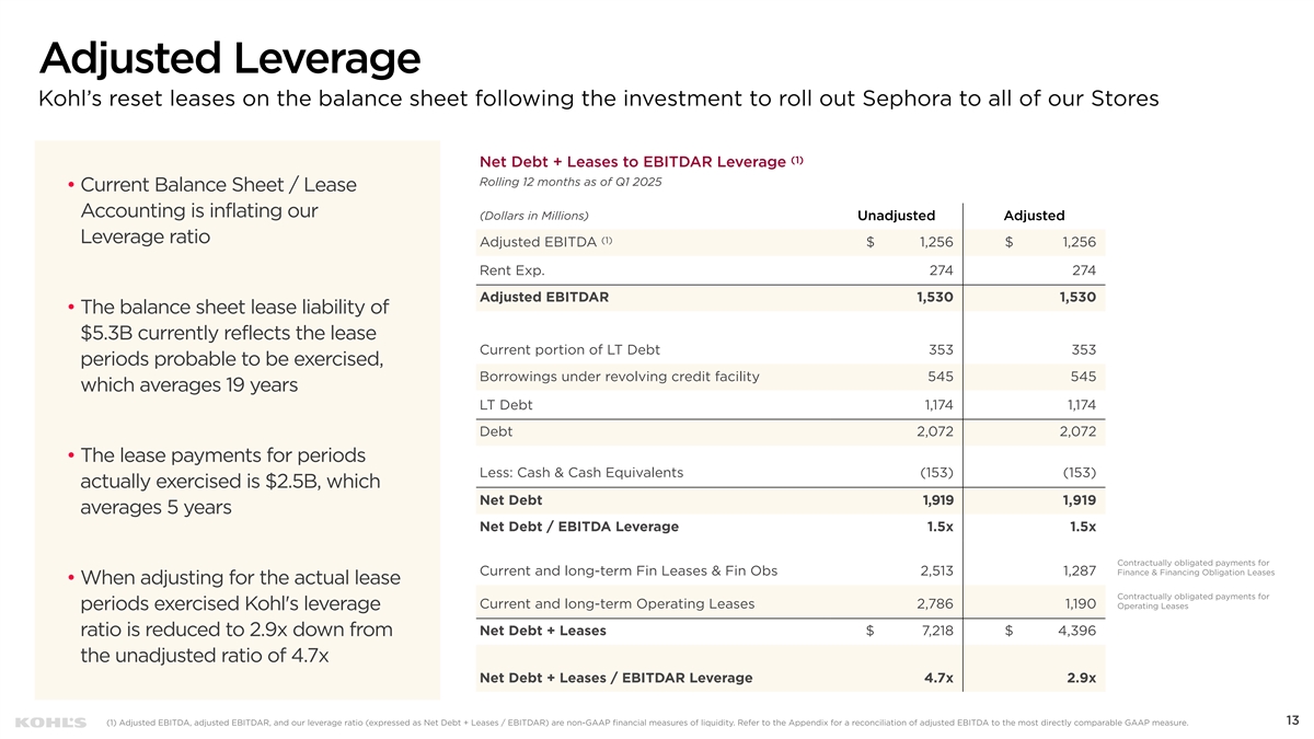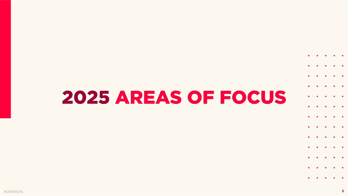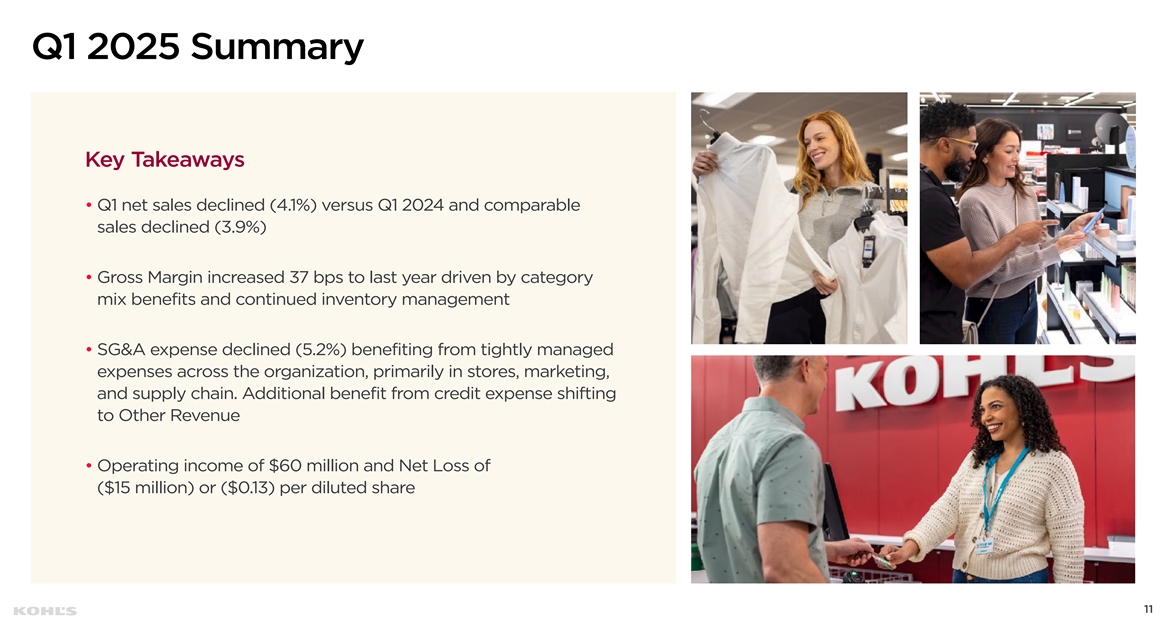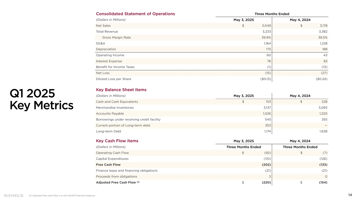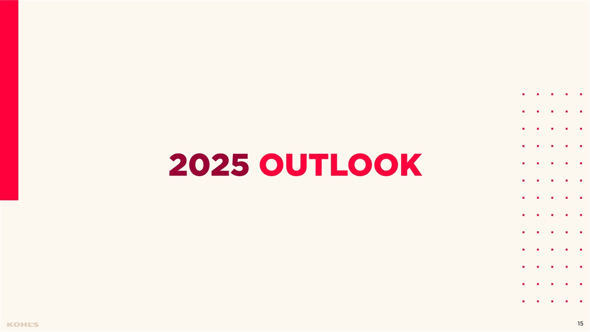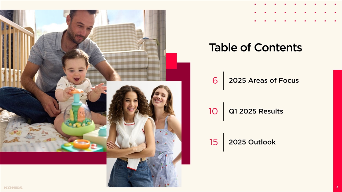 Cautionary Statement Regarding Forward-Looking Information This presentation contains “forward-looking statements” within the meaning of the Private Securities Litigation Reform Act of 1995. The Company intends forward-looking terminology such as “believes,” “expects,” “may,” “will,” “should,” “anticipates,” “plans,” or similar expressions to identify forward-looking statements. Forward-looking statements include, but are not limited to, statements regarding our 2025 areas of focus and future initiatives, the information under 2025 Outlook, comments about Kohl's adequacy of capital resources, and statements regarding the impact of macroeconomic events and our response to such events, including tariffs. Such statements are subject to certain risks and uncertainties, which could cause the Company's actual results to differ materially from those anticipated by the forward-looking statements. These risks and uncertainties include, but are not limited to, risks described more fully in Item 1A in the Company’s Annual Report on Form 10-K, which are expressly incorporated herein by reference, and other factors as may periodically be described in the Company’s filings with the SEC. Any number of risks and uncertainties could cause actual results to differ materially from those Kohl’s expresses in its forward-looking statements. Forward-looking statements relate to the date initially made, and Kohl’s undertakes no obligation to update them. Non-GAAP Financial Measures This presentation contains certain financial measures that are not prepared in accordance with generally accepted accounting principles (GAAP), including adjusted EBITDA, adjusted EBITDAR, our leverage ratio (expressed as Net Debt + Leases / EBITDAR), and adjusted free cash flow. These non-GAAP financial measures are provided as additional insight into our operational performance and do not purport to be substitutes for, or superior to net income, total debt and lease liabilities as reported on the balance sheet, or operating cash flow as measures of operating performance or liquidity. We believe these adjusted measures are useful, as they are more representative of our core business, enhance comparability across reporting periods and to industry peers, and align with the measures used by management to evaluate the Company’s performance. We caution investors that non-GAAP measures should not be viewed in isolation and should be evaluated in addition to, and not as an alternative for, our results reported in accordance with GAAP. Because companies may use different calculation methods, these measures may not be comparable to other similarly titled measures reported by other companies. A reconciliation of each non-GAAP measure to the most directly comparable GAAP measure is included in this presentation. 2