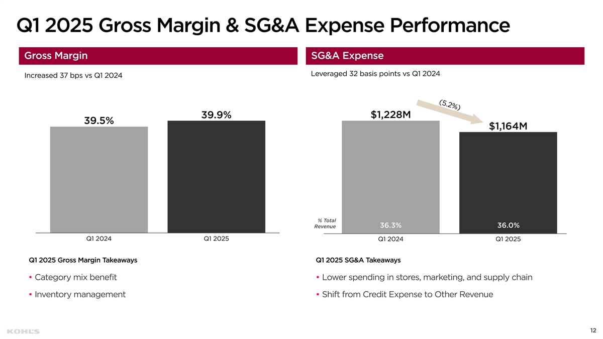 Q1 2025 Summary Key Takeaways • Q1 net sales declined (4.1%) versus Q1 2024 and comparable sales declined (3.9%) • Gross Margin increased 37 bps to last year driven by category mix benefits and continued inventory management • SG&A expense declined (5.2%) benefiting from tightly managed expenses across the organization, primarily in stores, marketing, and supply chain. Additional benefit from credit expense shifting to Other Revenue • Operating income of $60 million and Net Loss of ($15 million) or ($0.13) per diluted share 11 11