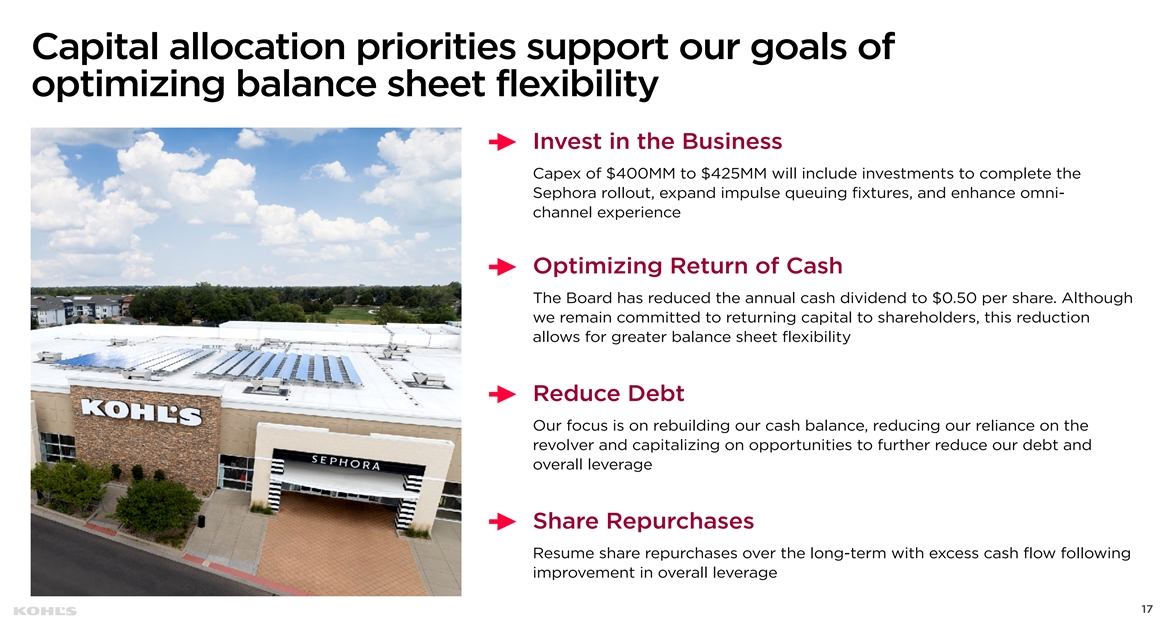 2025 Outlook Maintained METRIC FULL YEAR GUIDANCE Net Sales (5%) to (7%) vs. 2024 Comp Sales (4%) to (6%) Operating 2.2% to 2.6% Margin Diluted EPS $0.10 to $0.60 Capital Allocation Outlook • Capex: $400 million to $425 million • Dividend: $0.125 dividend payable on June 25, 2025 • Debt: Refinanced July 2025 maturities 16