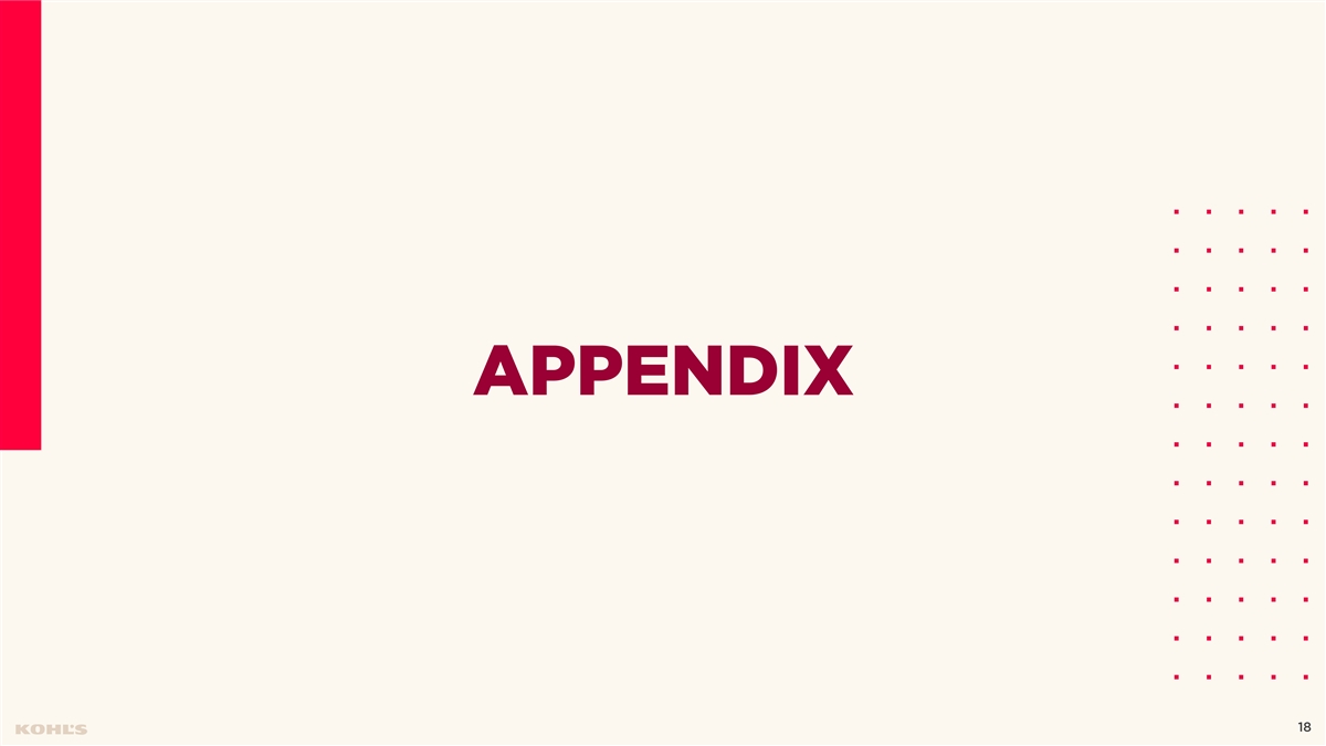 Capital allocation priorities support our goals of optimizing balance sheet flexibility Invest in the Business Capex of $400MM to $425MM will include investments to complete the Sephora rollout, expand impulse queuing fixtures, and enhance omni- channel experience Optimizing Return of Cash The Board has reduced the annual cash dividend to $0.50 per share. Although we remain committed to returning capital to shareholders, this reduction allows for greater balance sheet flexibility Reduce Debt Our focus is on rebuilding our cash balance, reducing our reliance on the revolver and capitalizing on opportunities to further reduce our debt and overall leverage Share Repurchases Resume share repurchases over the long-term with excess cash flow following improvement in overall leverage 17