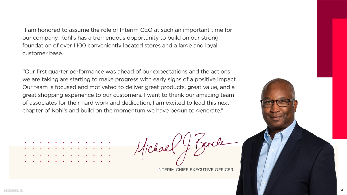 “I am honored to assume the role of Interim CEO at such an important time for our company. Kohl’s has a tremendous opportunity to build on our strong foundation of over 1,100 conveniently located stores and a large and loyal customer base. “Our first quarter performance was ahead of our expectations and the actions we are taking are starting to make progress with early signs of a positive impact. Our team is focused and motivated to deliver great products, great value, and a great shopping experience to our customers. I want to thank our amazing team of associates for their hard work and dedication. I am excited to lead this next chapter of Kohl’s and build on the momentum we have begun to generate.” INTERIM CHIEF EXECUTIVE OFFICER 4