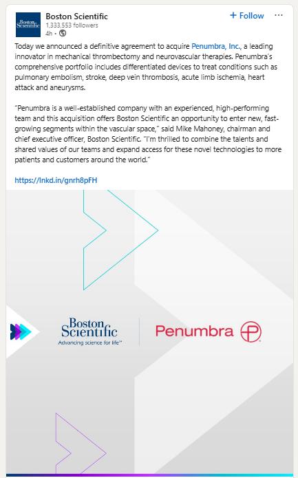 Today we announced a definitive agreement to acquire Penumbra, Inc. a leading innovator in mechanical thrombectomy and neurovascular therapies. Penumbra's comprehensive portfolio includes differentiated devices to treat conditions such as pulmonary embolism, stroke, deep vein thrombosis, acute limb ischemia. heart attack and aneurysms. "Penumbra is a well-established company with an experienced, high-performing team and this acquisition offers Boston Scientific an opportunity to enter new, fast-growing segments within the vascular space," said Mike Mahoney, chairman and chief executive officer, Boston Scientific. "I'm thrilled to combine the talents and shared values of our teams and expand access for these novel technologies to more patients and customers around the world."