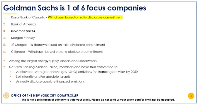 A revised Presentation is also available at https://comptroller.nyc.gov/wp-content/uploads/2024/04/NYCRS-Clean-Energy-Financing-Ratio-Presentation_REV-FINAL.pdf. This version includes company-specific information on Goldman Sachs’ fossil fuel strategy, low-carbon financing commitments, and climate-related financial disclosures relevant to Proposal 7. It also includes company-specific details in support of NYCRS' similar proposals at Bank of America (April 24, 2024 AGM) and Morgan Stanley (May 23, 2024 AGM).