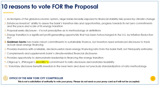 For its future communications with investors, the Office of the New York City Comptroller will revise its Presentation in support of Proposal 7, filed with the SEC on March 21, 2024, to reflect RBC’s commitment. The revised slides (slides 4 and 5) are included on page 2 below, with the changes reflecting RBC’s commitment highlighted in yellow. No other slides from the Presentation have been changed.