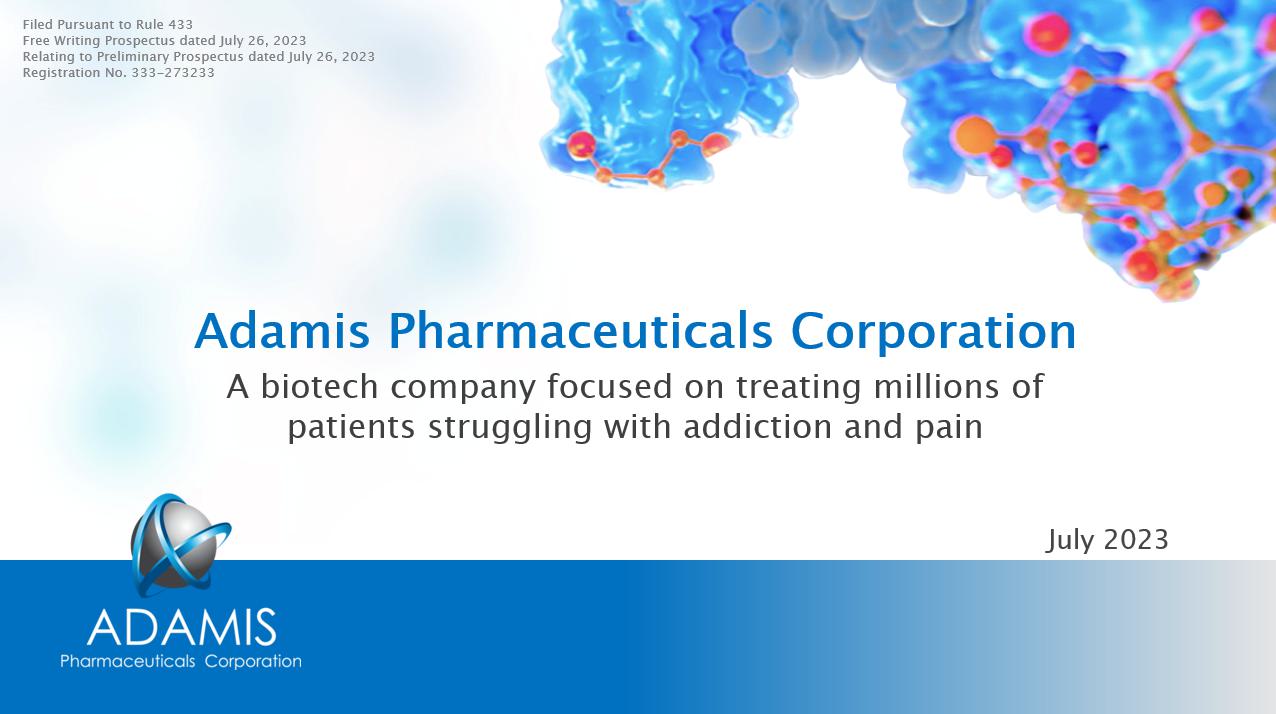 Adamis Pharmaceuticals Corporation A biotech company focused on treating millions of patients struggling with addiction and pain July 2023 Filed Pursuant to Rule 433 Free Writing Prospectus dated July 26, 2023 Relating to Preliminary Prospectus dated July 26, 2023 Registration No. 333 - 273233