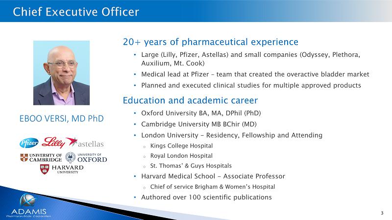 In addition, many forward-looking statements concerning our anticipated future activities assume access to sufficient funding to support the Company’s continued operations and such planned activities. There are no assurances that the Company will have adequate financial resources to fund its future activities and obligations. This presentation also contains estimates and other data based on publications and research, surveys and studies. These data involve a number of assumptions and limitations, and you are cautioned not to give undue weight to such estimates. The Company has not independently verified the data generated by third parties and, accordingly, cannot guarantee their accuracy or completeness. This presentation includes products that are under clinical investigation, which have not yet been approved for marketing by the FDA. They are currently limited by federal law to investigational use, and no representation is made as to their safety or effectiveness for the purposes for which they are being investigated. You should not place undue reliance on any forward-looking statements, which speak only as of the date of this presentation. Except as required by law, the Company does not undertake to update forward-looking statements in this presentation to reflect actual results, changes in assumptions or changes in other factors affecting such forward-looking information. The Company intends that all forward-looking statements be subject to the safe-harbor provisions of the PSLRA, to the extent applicable.
