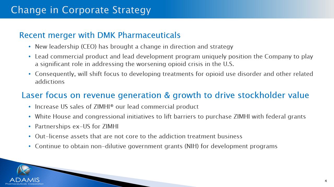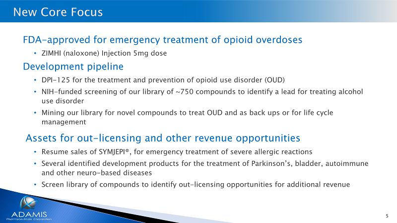 4 Recent merger with DMK Pharmaceuticals • New leadership (CEO) has brought a change in direction and strategy • Lead commercial product and lead development program uniquely position the Company to play a significant role in addressing the worsening opioid crisis in the U.S. • Consequently, will shift focus to developing treatments for opioid use disorder and other related addictions Laser focus on revenue generation & growth to drive stockholder value • Aggressively increase US sales of ZIMHI® our lead commercial product • White House and congressional initiatives to lift barriers to purchase ZIMHI with federal grants • Partnerships ex - US for ZIMHI • Out - license many assets that are not core to the addiction treatment business • Continue to obtain non - dilutive government grants (NIH) for development programs