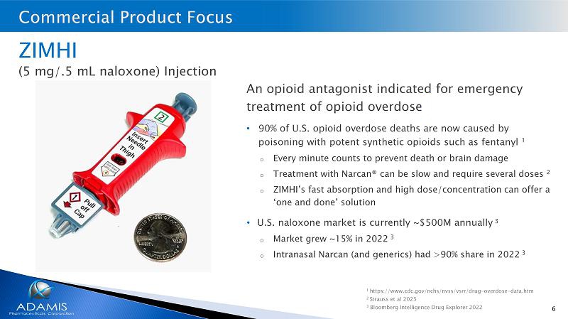 5 FDA - approved for emergency treatment of opioid overdoses • ZIMHI (naloxone) Injection 5mg dose Development pipeline • DPI - 125 for the treatment and prevention of opioid use disorder (OUD) • NIH - funded screening of our library of ~750 compounds to identify a lead for treating alcohol use disorder • Mining our library for novel compounds to treat OUD and as back ups or for life cycle management Assets for out - licensing and other revenue opportunities • Resume sales of SYMJEPI®, for emergency treatment of severe allergic reactions • Several identified development products for the treatment of Parkinson’s, bladder, autoimmune and other neuro - based diseases • Screen library of compounds to identify out - licensing opportunities for additional revenue