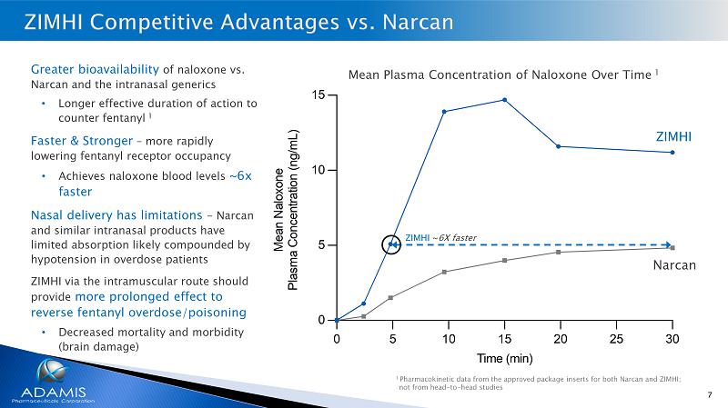 6 ZIMHI (5 mg/.5 mL naloxone) Injection An opioid antagonist indicated for emergency treatment of opioid overdose • 90% of U.S. opioid overdose deaths are now caused by poisoning with potent synthetic opioids such as fentanyl 1 o Every minute counts to prevent death or brain damage o Treatment with Narcan® can be slow and require several doses 2 o ZIMHI’s fast absorption and high dose/concentration can offer a ‘one and done’ solution • U.S. naloxone market is currently ~$500M annually 3 o Market grew ~15% in 2022 3 o Intranasal Narcan (and generics) had >90% share in 2022 3 1 https://www.cdc.gov/nchs/nvss/vsrr/drug - overdose - data.htm 2 Strauss et al 2023 3 Bloomberg Intelligence Drug Explorer 2022