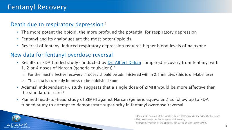 7 Greater bioavailability of naloxone vs. Narcan and the intranasal generics • Longer effective duration of action to counter fentanyl 1 Faster & Stronger – more rapidly lowering fentanyl receptor occupancy • Achieves naloxone blood levels ~6x faster Nasal delivery has limitations - Narcan and similar intranasal products have limited absorption likely compounded by hypotension in overdose patients ZIMHI via the intramuscular route should provide more prolonged effect to reverse fentanyl overdose/poisoning • Decreased mortality and morbidity (brain damage) Mean Plasma Concentration of Naloxone Over Time 1 0 5 10 15 20 25 30 0 5 10 15 Time (min) M e a n N a l o x o n e P l a s m a C o n c e n t r a t i o n ( n g / m L ) Narcan ZIMHI ZIMHI ~ 6 X faster 1 Pharmacokinetic data from the approved package inserts for both Narcan and ZIMHI; not from head - to - head studies