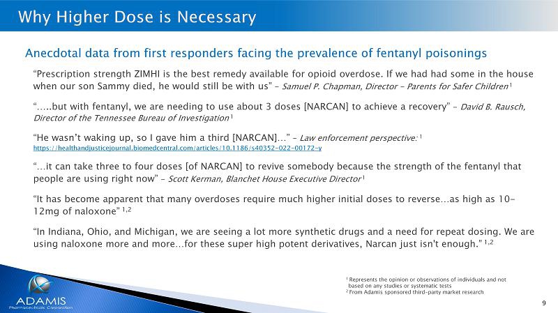 8 Death due to respiratory depression 1 • The more potent the opioid, the more profound the potential for respiratory depression • Fentanyl and its analogues are the most potent opioids • Reversal of fentanyl induced respiratory depression requires higher blood levels of naloxone New data for fentanyl overdose reversal • Results of FDA funded study conducted by Dr. Albert Dahan compared recovery from fentanyl with 1, 2 or 4 doses of Narcan (generic equivalent) 2 o For the most effective recovery, 4 doses should be administered within 2.5 minutes (this is off - label use) o This data is currently in press to be published soon • Adamis’ independent PK study suggests that a single dose of ZIMHI would be more effective than the standard of care 3 • Planned head - to - head study of ZIMHI against Narcan (generic equivalent) as follow up to FDA funded study to attempt to demonstrate superiority in fentanyl overdose reversal 1 Represents opinion of the speaker - based statements in the scientific literature 2 FDA presentation at the Reagan - Udall meeting 3 Represents opinion of the speaker, not based on any specific study