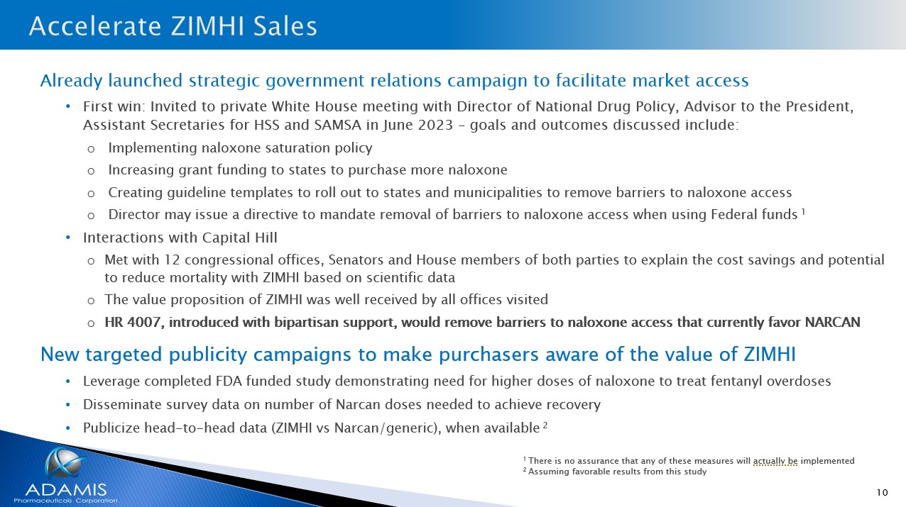 9 Anecdotal data from first responders facing the prevalence of fentanyl poisonings “Prescription strength ZIMHI is the best remedy available for opioid overdose. If we had had some in the house when our son Sammy died, he would still be with us” - Samuel P. Chapman, Director - Parents for Safer Children 1 “…..but with fentanyl, we are needing to use about 3 doses [NARCAN] to achieve a recovery” - David B. Rausch, Director of the Tennessee Bureau of Investigation 1 “He wasn’t waking up, so I gave him a third [NARCAN]…” – Law enforcement perspective: 1 https://healthandjusticejournal.biomedcentral.com/articles/10.1186/s40352 - 022 - 00172 - y “…it can take three to four doses [of NARCAN] to revive somebody because the strength of the fentanyl that people are using right now” - Scott Kerman, Blanchet House Executive Director 1 “It has become apparent that many overdoses require much higher initial doses to reverse…as high as 10 - 12mg of naloxone” 1,2 “In Indiana, Ohio, and Michigan, we are seeing a lot more synthetic drugs and a need for repeat dosing. We are using naloxone more and more…for these super high potent derivatives, Narcan just isn't enough.” 1,2 1 Represents the opinion or observations of individuals and not based on any studies or systematic tests 2 From Adamis sponsored third - party market research