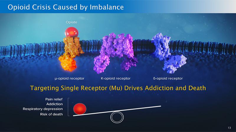 12 Opioid use is a worsening health crisis Every 7 minutes a person dies in the US of an opioid overdose 1 According to the CDC: ~1.6 million Americans report suffering from opioid use disorder (OUD) 2 Rx options include methadone, buprenorphine and naltrexone (all old), but 87% do not receive evidence - based medical treatment 3 Market concerns Prescription and illicit opioids target the mu opioid receptor, which provides potent pain relief However, binding only to the mu receptor can lead to addiction and death A balanced physiological approach that mimics the body’s own endorphins is needed 0 20,000 40,000 60,000 80,000 100,000 120,000 2016 2017 2018 2019 2020 2021 2022 US Drug Overdose Deaths by Drug Class 4 Total Overdoses Opioids Synthetics 1 www.cdc.gov/nchs/nvss/vsrr/drug - overdose - data.htm 2 https://www.cdc.gov/stopoverdose/stigma/index.html 3 https://www.sciencedirect.com/science/article/pii/S0955395922002031 4 US Centers for Disease Control and Prevention