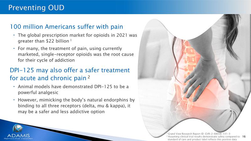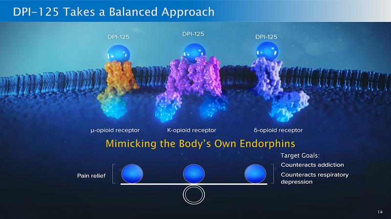 16 100 million Americans suffer with pain The global prescription market for opioids in 2021 was greater than $22 billion 1 For many, the treatment of pain, using currently marketed, single - receptor opioids was the root cause for their cycle of addiction DPI - 125 may also offer a safer treatment for acute and chronic pain 2 Animal models have demonstrated DPI - 125 to be a powerful analgesic However, mimicking the body’s natural endorphins by binding to all three receptors (delta, mu & kappa), it may be a safer and less addictive option 1 Grand View Research Report ID: GVR - 2 - 68038 - 131 - 3 2 Assuming clinical trial results demonstrate safety compared to standard of care and product label reflects this positive data