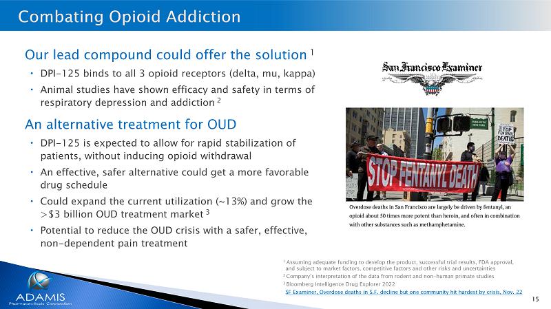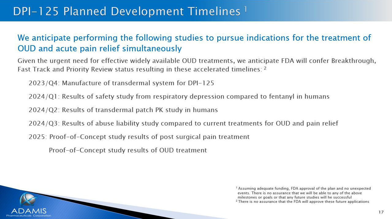 17 We anticipate performing the following studies to pursue indications for the treatment of OUD and acute pain relief simultaneously Given the urgent need for effective widely available OUD treatments, we anticipate FDA will confer Breakthrough, Fast Track and Priority Review status resulting in these accelerated timelines: 2 2023: Manufacture of transdermal system for DPI - 125 2024: Results of safety from respiratory depression compared to fentanyl in humans Results of transdermal patch PK in humans Results of abuse liability study compared to current treatments for OUD and pain relief 2025: Proof - of - Concept study results of post surgical pain treatment Proof - of - Concept study results of OUD treatment 2026: Phase 2 results of acute pain treatment Phase 2 results of efficacy for OUD treatment 1 Assuming adequate funding, FDA approval of the plan and no unexpected events. There is no assurance that we will be able to any of the above milestones or goals or that any future studies will he successful 2 There is no assurance that the FDA will approve these future applications