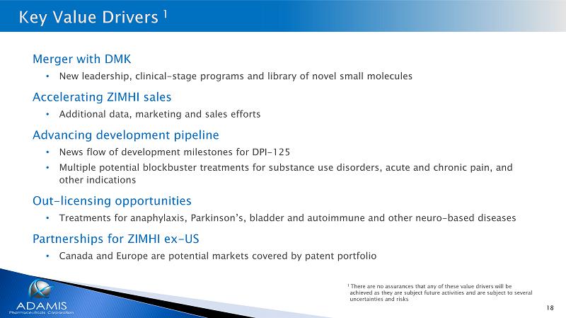 18 Merger with DMK • New leadership, clinical - stage programs and library of novel small molecules Accelerating ZIMHI sales • Additional data, marketing and sales efforts Advancing development pipeline • News flow of development milestones for DPI - 125 • Multiple potential blockbuster treatments for substance use disorders, acute and chronic pain, and other indications Out - licensing opportunities • Treatments for anaphylaxis, Parkinson’s, bladder and autoimmune and other neuro - based diseases Partnerships for ZIMHI ex - US • Canada and Europe are potential markets covered by patent portfolio 1 There are no assurances that any of these value drivers will be achieved as they are subject future activities and are subject to several uncertainties and risks