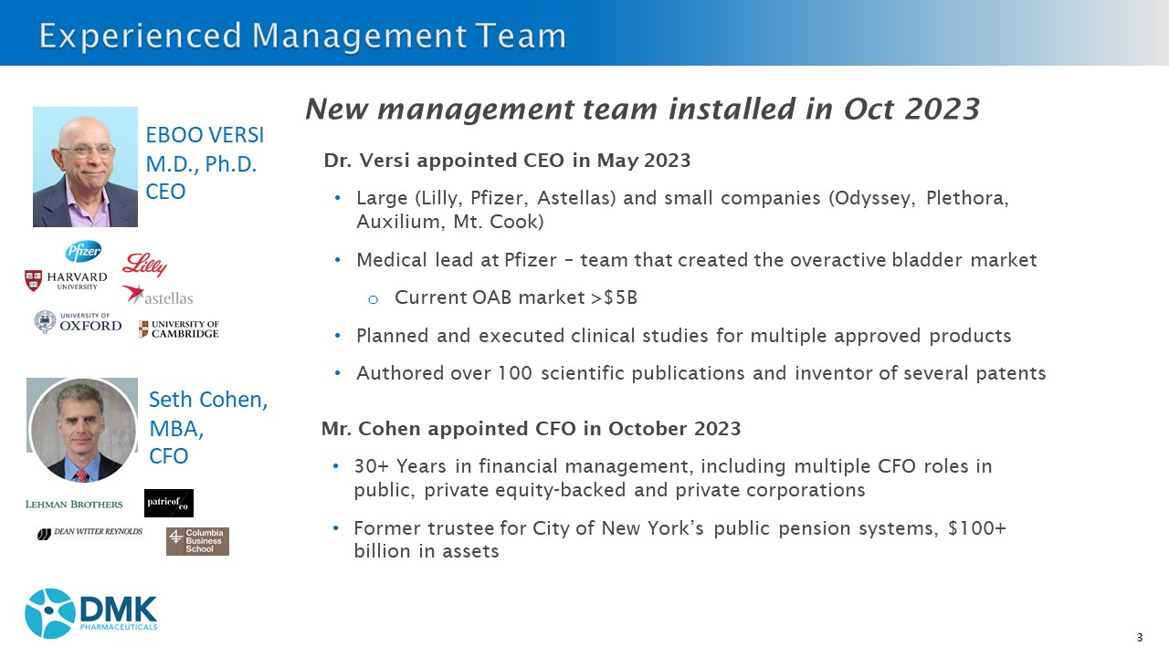 3 Dr. Versi appointed CEO in May 2023 • Large (Lilly, Pfizer, Astellas) and small companies (Odyssey, Plethora, Auxilium, Mt. Cook) • Medical lead at Pfizer – team that created the overactive bladder market o Current OAB market >$5B • Planned and executed clinical studies for multiple approved products • Authored over 100 scientific publications and inventor of several patents EBOO VERSI M.D., Ph.D. CEO Founder, Chairman and CEO Seth Cohen, MBA, CFO Founder, Chairman and CEO Mr. Cohen appointed CFO in October 2023 • 30+ Years in financial management, including multiple CFO roles in public, private equity - backed and private corporations • Former trustee for City of New York’s public pension systems, $100+ billion in assets New management team installed in Oct 2023