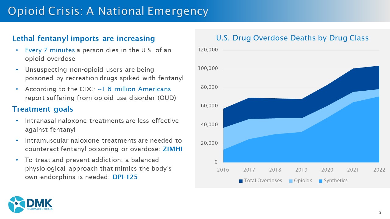 4 New Management in October 2023 • Change in direction and strategy: Treatment of substance use disorder. o Focus on opioid crisis by commercializing ZIMHI® and developing DPI - 125 with non - dilutive funding • Business development activities to monetize non - core assets Laser focus on revenue generation & growth to drive stockholder value • Increase U.S. sales of ZIMHI® our lead commercial product o White House and congressional initiatives to lift barriers to purchase ZIMHI with federal grants o Partnerships in US & ex - U.S. for ZIMHI • Out - license SYMJEPI® and other assets that are not core to the addiction business • Execute NIH funded program and continue to obtain non - dilutive government grants for development and discovery (~750 NCE) programs