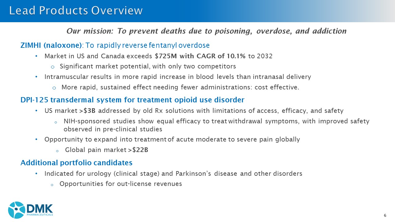 5 Lethal f entanyl imports are increasing • Every 7 minutes a person dies in the U.S. of an opioid overdose • Unsuspecting n on - opioid users are being poisoned by recreation drugs spiked with fentanyl • According to the CDC: ~1.6 million Americans report suffering from opioid use disorder (OUD) Treatment goals • I ntranasal naloxone treatments are less effective against fentanyl • Intramuscular naloxone treatments are needed to counteract fentanyl poisoning or overdose: ZIMHI • To treat and prevent addiction, a balanced physiological approach that mimics the body’s own endorphins is needed: DPI - 125 0 20,000 40,000 60,000 80,000 100,000 120,000 2016 2017 2018 2019 2020 2021 2022 U.S. Drug Overdose Deaths by Drug Class Total Overdoses Opioids Synthetics