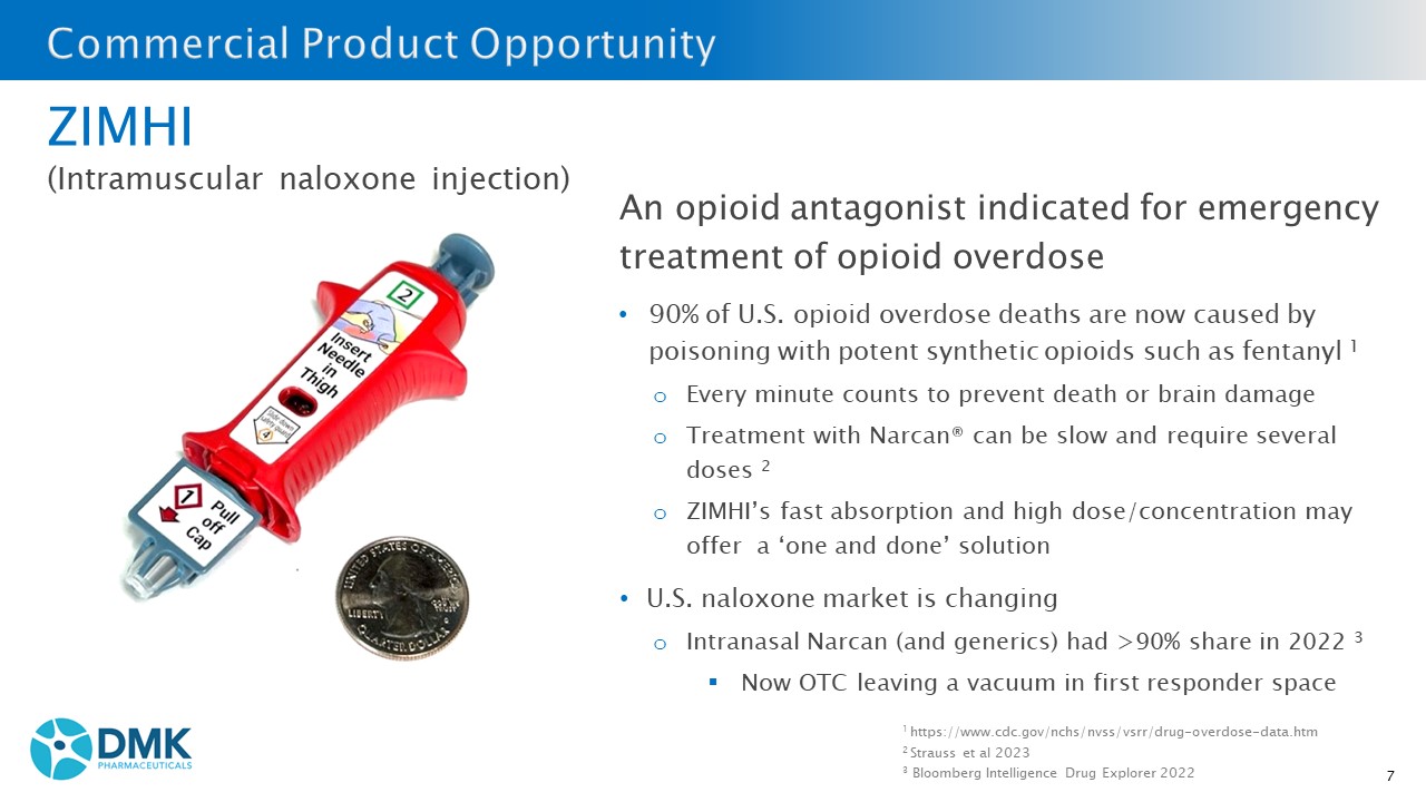 6 Our mission: To prevent deaths due to poisoning, overdose, and addiction ZIMHI (naloxone) : T o rapidly reverse fentanyl overdose • M arket in US and Canada exceeds $725M with CAGR of 10.1% to 2032 o Significant market potential, with only two competitors • Intramuscular results in more rapid increase in blood levels than intranasal delivery o More rapid, sustained effect needing fewer administrations: cost effective. DPI - 125 transdermal system for treatment opioid use disorder • US market >$3B addressed by old Rx solutions with limitations of access, efficacy, and safety o NIH - sponsored studies show equal efficacy to treat withdrawal symptoms, with improved safety observed in pre - clinical studies • Opportunity to expand into treatment of acute moderate to severe pain globally o Global pain market >$22B Additional portfolio candidates • Indicated for urology (clinical stage) and Parkinson’s disease and other disorders o Opportunities for out - license revenues