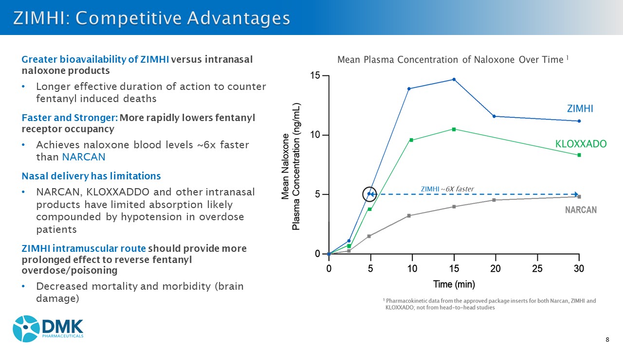 7 ZIMHI (Intramuscular naloxone injection) An opioid antagonist indicated for emergency treatment of opioid overdose • 90% of U.S. opioid overdose deaths are now caused by poisoning with potent synthetic opioids such as fentanyl 1 o Every minute counts to prevent death or brain damage o Treatment with Narcan® can be slow and require several doses 2 o ZIMHI’s fast absorption and high dose/concentration may offer a ‘one and done’ solution • U.S. naloxone market is changing o Intranasal Narcan (and generics) had >90% share in 2022 3 ▪ Now OTC leaving a vacuum in first responder space 1 https://www.cdc.gov/nchs/nvss/vsrr/drug - overdose - data.htm 2 Strauss et al 2023 3 Bloomberg Intelligence Drug Explorer 2022