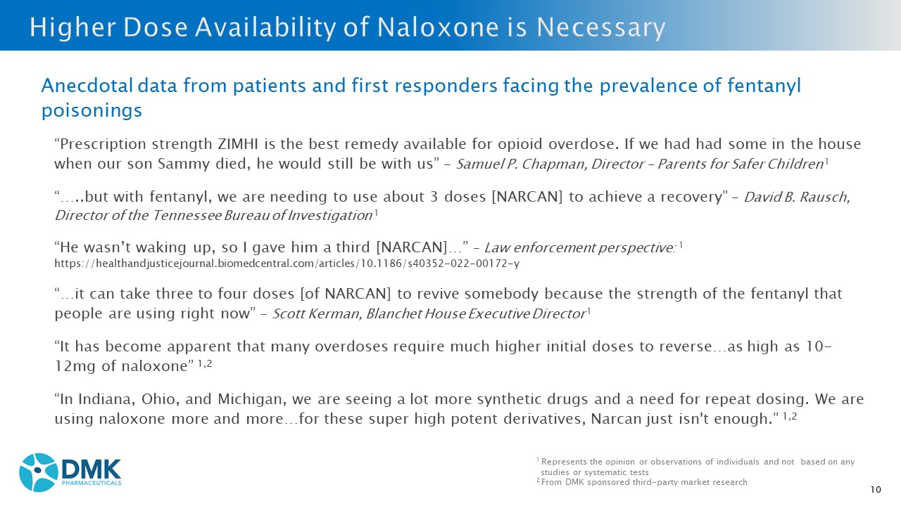 9 Death due to respiratory depression 1 • The more potent the opioid, the more profound the potential for respiratory depression • Fentanyl and its analogues are the most potent opioids • Reversal of fentanyl induced respiratory depression requires higher blood levels of naloxone New data for fentanyl overdose reversal • Results of FDA funded study conducted by Dr. Albert Dahan compared recovery from fentanyl with 1, 2 or 4 doses of Narcan (generic equivalent) 2 o For the most effective recovery, 4 doses should be administered within 2.5 minutes (this is off - label use) o This data is currently in press to be published soon • DMK’s independent PK study suggests that a single dose of ZIMHI would be more effective than the standard of care 3 • Currently a head - to - head study of ZIMHI against Narcan (generic equivalent) as follow up to FDA funded study (Dr. Dahan ) is being performed to attempt to demonstrate superiority in fentanyl overdose reversal 1 Represents opinion of the speaker - based statements in the scientific literature 2 FDA presentation at the Reagan - Udall meeting 3 Represents opinion of the speaker, not based on any specific study