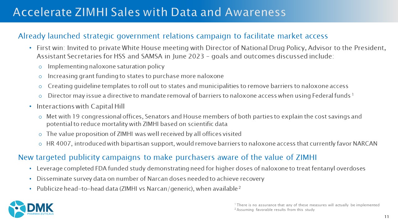 10 Anecdotal data from patients and first responders facing the prevalence of fentanyl poisonings “Prescription strength ZIMHI is the best remedy available for opioid overdose. If we had had some in the house when our son Sammy died, he would still be with us” - Samuel P. Chapman, Director - Parents for Safer Children 1 “…..but with fentanyl, we are needing to use about 3 doses [NARCAN] to achieve a recovery” - David B. Rausch, Director of the Tennessee Bureau of Investigation 1 “He wasn’t waking up, so I gave him a third [NARCAN]…” – Law enforcement perspective: 1 https://healthandjusticejournal.biomedcentral.com/articles/10.1186/s40352 - 022 - 00172 - y “…it can take three to four doses [of NARCAN] to revive somebody because the strength of the fentanyl that people are using right now” - Scott Kerman, Blanchet House Executive Director 1 “It has become apparent that many overdoses require much higher initial doses to reverse…as high as 10 - 12mg of naloxone” 1,2 “In Indiana, Ohio, and Michigan, we are seeing a lot more synthetic drugs and a need for repeat dosing. We are using naloxone more and more…for these super high potent derivatives, Narcan just isn't enough.” 1,2 1 Represents the opinion or observations of individuals and not based on any studies or systematic tests 2 From DMK sponsored third - party market research