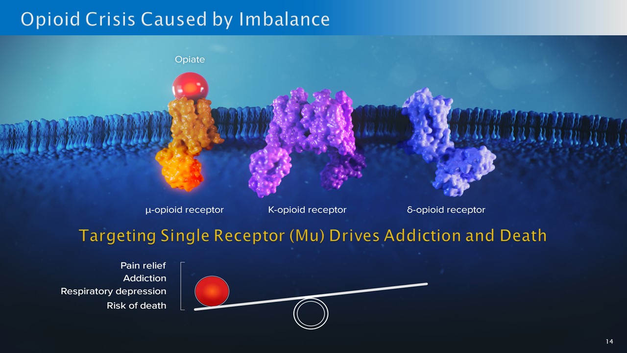 13 Opioid use is a worsening health crisis • Every 7 minutes a person dies in the U.S. of an opioid overdose 1 • According to the CDC: ~1.6 million Americans report suffering from opioid use disorder (OUD) 2 • Rx options include methadone, buprenorphine and naltrexone (all old), but 87% do not receive evidence - based medical treatment 3 Market concerns • Prescription and illicit opioids target the mu opioid receptor, which provides potent pain relief • However, binding only to the mu receptor can lead to addiction and death • A balanced physiological approach that mimics the body’s own endorphins is needed 1 www.cdc.gov/nchs/nvss/vsrr/drug - overdose - data.htm 2 https://www.cdc.gov/stopoverdose/stigma/index.html 3 https://www.sciencedirect.com/science/article/pii/S0955395922002031 4 U.S. Centers for Disease Control and Prevention