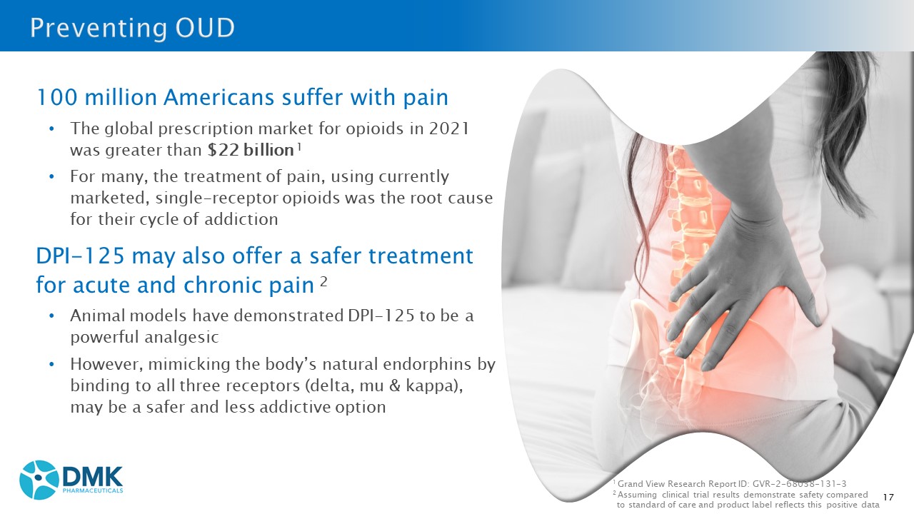 16 New solution: DPI - 125 1 • Clinical stage asset • Animal studies have shown efficacy and safety in terms of respiratory depression and addiction with potent analgesia 2 Alternative treatment for OUD and pain • Current options methadone and buprenorphine (>40 years old) but they work and yet only ~ 13 % get this medical treatment o They are addictive, are difficult to access (drug scheduling) and patients have to undergo withdrawal symptoms. • DPI - 125 is not expected to have these issues so could significantly grow the >$3 billion OUD treatment market 3 o Potential to reduce the OUD crisis by prevention with a safer, effective, non - dependent pain treatment (100 million Americans: $22B market) 4 Assuming adequate funding to develop the product, successful trial results, FDA approval, and subject to market factors, competitive factors and other risks and uncertainties 2 Company’s interpretation of the data from rodent and non - human primate studies 3 Bloomberg Intelligence Drug Explorer 2022 4 SF Examiner, Overdose deaths in S.F. decline but one community hit hardest by crisis, Nov. 22