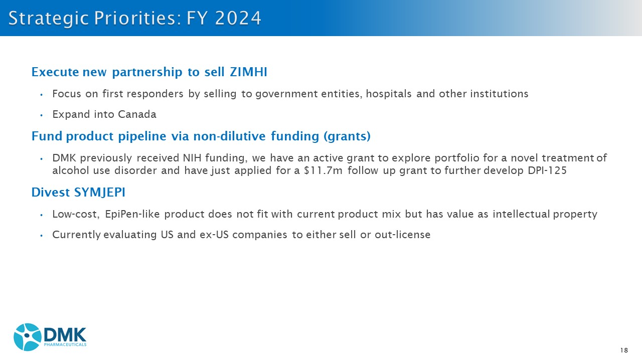 18 Execute new partnership to sell ZIMHI • Focus on first responders by selling to government entities, hospitals and other institutions • Expand into Canada Fund product pipeline via non - dilutive funding (grants) • DMK previously received NIH funding, we have an active grant to explore portfolio for a novel treatment of alcohol use disorder and have just applied for a $11.7m follow up grant to further develop DPI - 125 Divest SYMJEPI • Low - cost, EpiPen - like product does not fit with current product mix but has value as intellectual property • Currently evaluating US and ex - US companies to e ither sell or out - license