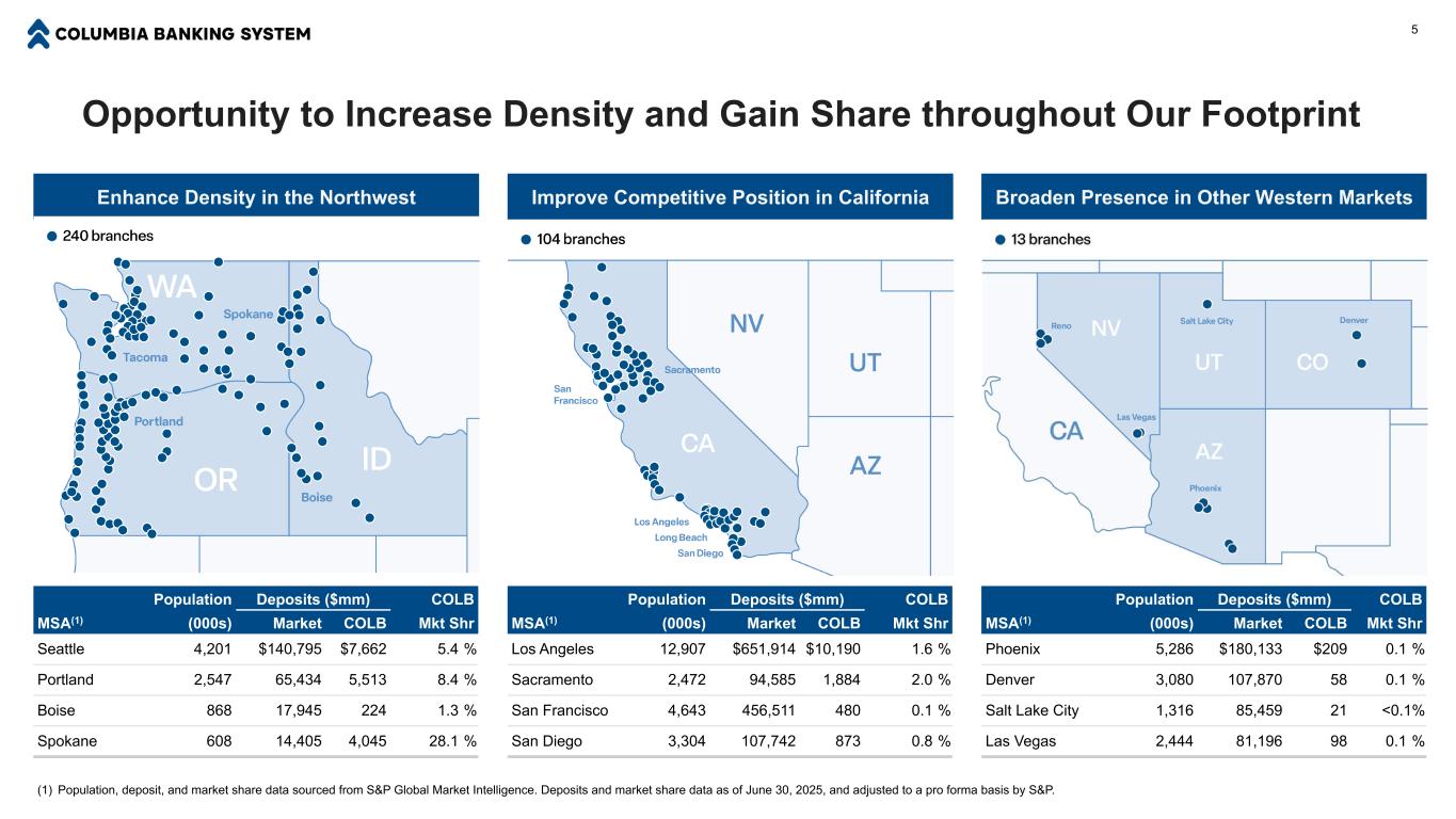 Operating in Large, Attractive Western Markets 4 Established Presence throughout the West(1) Northwest (population in millions) Seattle, WA Portland, OR California and Nevada Los Angeles, CA Sacramento, CA Other West Phoenix, AZ Denver, CO 4.2mm 2.5mm 12.9mm 2.5mm 5.3mm 3.0mm Top Regional Bank in Northwest (WA, OR, ID)(1) Total Northwest Rank Bank (HQ State) Assets ($B) Deposits ($B) Mkt Shr 1 Bank of America (NC) $3,404 $58 16.5 % 2 U.S. Bancorp (MN) 695 51 14.4 % 3 JPMorgan (NY) 4,560 44 12.4 % 4 Wells Fargo (CA) 2,063 40 11.3 % 5 COLB (WA) 67 35 9.8 % 6 KeyCorp (OH) 187 19 5.3 % 7 WaFd (WA) 27 13 3.6 % 8 Banner Corp. (WA) 17 11 3.1 % 4th Largest Regional Bank HQ’d in Footprint(1) Total Eight-State Footprint Rank Bank (HQ State) Assets ($B) Deposits ($B) Mkt Shr 1 Western Alliance (AZ) $91 $70 1.9 % 2 Zions (UT) 89 59 1.6 % 3 East West (CA) 80 51 1.4 % 4 COLB (WA) 67 56 1.5 % 5 Banc of California (CA) 34 22 0.6 % 6 WaFd (WA) 27 19 0.5 % 7 Cathay General (CA) 24 16 0.4 % 8 Mechanics (CA) 23 19 0.5 % Strong Foothold in Attractive Markets(1) ■ Our market share in the Northwest stands with large national and super regional banks, at nearly 10% ■ Our foothold in top western markets and scaled franchise provide us the opportunity to increase share in California, Arizona, Colorado, and Utah ■ Densely populated metropolitan areas provide opportunity for our bankers to take market share as we grow where businesses are growing ■ Current household income in our footprint is 110% of the national average, and the five-year growth rate of 13.0% compares favorably to 11.3% nationally Boise, ID Salt Lake City, UT Las Vegas, NV 0.9mm 2.4mm 1.3mm (1) Population, household income, and asset data sourced from S&P Global Market Intelligence. Total assets as of September 30, 2025 and adjusted to a pro forma basis for recently closed acquisitions, if applicable. Deposits and market share data sourced from the Federal Deposit Insurance Corporation (“FDIC”) as of June 30, 2025 and adjusted to a pro forma basis. Groups represent banks headquartered in the United States, and money center banks are excluded from the footprint analysis (bottom table).