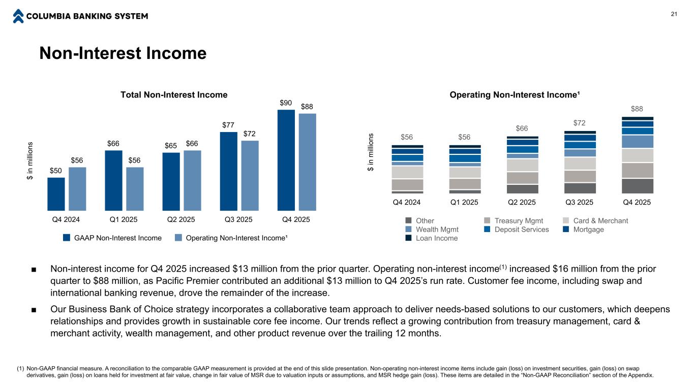 Select Asset and Liability Maturity and Repricing Schedules (in Months) at December 31, 2025 ($ in millions) <=3 4 to 6 7 to 12 13 to 24 25 to 36 >36 Total % Total(3) Loans Fixed (maturity)(2) $444 $200 $450 $1,088 $1,109 $12,374 $15,665 32% Floating (repricing)(2) 15,427 — — — — — 15,427 32% Adjustable (repricing) 819 1,385 2,283 2,762 2,057 8,142 17,448 36% Total Loans $16,690 $1,585 $2,733 $3,850 $3,166 $20,516 $48,540 100% Time deposits (maturity)(4) $3,834 $1,863 $769 $80 $10 $18 $6,574 Average rate(4) 3.71% 3.24% 2.84% 1.21% 0.19% 0.23% 3.43% Term debt (maturity) $3,200 $— $— $— $— $— $3,200 Average rate 3.97% 3.97% Interest Rate Sensitivity 20 Note: Tables may not foot due to rounding. Loan totals on this slide do not include purchase accounting adjustments. Deferred fees and costs also drive variances between loan totals on this slide and loan totals in the earnings press release. (1) For the scenarios shown, the interest rate simulations assume a parallel and sustained shift in market interest rates ratably over a twelve-month period (ramp) or immediately (shock). The simulation repricing betas applied to interest-bearing deposits in the rising rate and declining rate scenarios are 49% and 49%, respectively, for December 31, 2025. Additional data related to interest rate simulations are available in Columbia’s Annual Report on Form 10-K for the fiscal year ended December 31, 2024. (2) Commercial tranche loans that mature in one month are included in the floating rate loan category, not the fixed rate loan category, as these loans reprice in a manner similar to floating rate loans. (3) Floating rate loans are indexed to prime (8% of the total loan portfolio) and 1-month underlying interest rates (24% of the total loan portfolio). When adjustable rate loans reprice, they are indexed to interest rates that span 1-month tenors to 10-year tenors as well as the prime rate; the most prevalent underlying index rates are 6-month tenors (17% of the total loan portfolio), 1-year tenors (9% of the portfolio), and 5-year tenors (7% of the total loan portfolio). (4) Time deposits maturing in 3 months or less include $2.1 billion in customer CDs at an average rate of 3.51% and $1.7 billion in brokered CDs at an average rate of 3.94%. (5) Deposit and funding repricing beta data present combined company results as if historical Columbia and historical Umpqua Holdings Corporation were one company for all periods through December 31, 2022; subsequent time periods present data on a legal basis given the merger. The beta presentation is calculated in this manner for comparison purposes. (6) The cost of interest-bearing deposits, total deposits, and total funding for the three months ended December 31, 2025 is calculated excluding a $12 million benefit related to the amortization of a premium on acquired time deposits. On a reported basis, which includes the benefit of the premium amortization, the cost of these items was 2.08%, 1.40%, and 1.57% and the repricing betas were 62%, 43%, and 54%, respectively, between Q4 2025 and Q2 2024. Interest Rate Simulation Impact on Net Interest Income at December 31, 2025(1) Ramp Shock Year 1 Year 2 Year 1 Year 2 Up 200 basis points 0.0% 3.4% 0.4% 5.3% Up 100 basis points 0.0% 1.6% 0.2% 2.5% Down 100 basis points 0.3% (1.4)% 0.2% (2.3)% Down 200 basis points 2.2% (1.6)% 1.9% (3.6)% Down 300 basis points 5.3% (1.5)% 5.0% (4.9)% Deposit and Funding Repricing Betas During Current Rate Cycle Effective Fed Funds Rate (Daily Avg.) Cost of: Three Months Ended Interest- Bearing Deposits Total Deposits Total Funding December 31, 2021(5) 0.08% 0.10% 0.05% 0.09% December 31, 2022(5) 3.65% 0.62% 0.35% 0.51% December 31, 2023 5.33% 2.54% 1.63% 2.05% June 30, 2024 5.33% 2.97% 2.01% 2.34% Variance: Q2 2024 less Q4 2021 5.25% 2.87% 1.96% 2.25% Repricing Betas: Rising Rate Cycle 55% 37% 43% December 31, 2024 4.66% 2.66% 1.80% 2.09% December 31, 2025(6) 3.90% 2.20% 1.48% 1.65% Variance: Q4 2025 less Q2 2024 (1.43)% (0.77)% (0.53)% (0.69)% Repricing Betas: Declining Rate Cycle-to-Date 54% 37% 48%