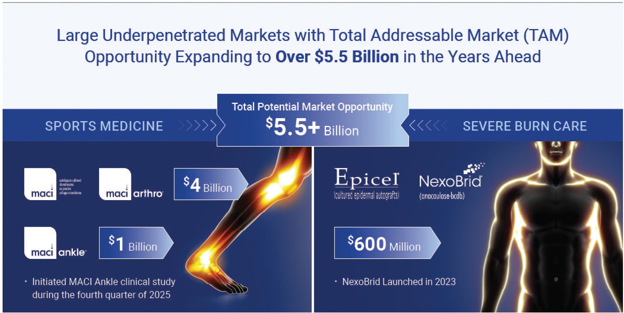 We also are focused on delivering MACI treatment to patients suffering from cartilage defects in the ankle, which represents largest market opportunity for MACI outside of the knee. Following an application to the FDA, we received Investigational New Drug (“IND”) clearance for MACI’s use in the ankle during the second quarter of 2025, and during the fourth quarter of 2025 we initiated a Study of MACI in Patients Aged 17 to 65 with Symptomatic Chondral or Osteochondral Defects of the Talus (“MASCOT”). MASCOT is a two-year prospective, multicenter, two-arm, parallel group open-label trial in which a total of 309 subjects, aged 17 to 65 will be randomized using a 2:1 ratio to receive a one-time treatment in the talus with MACI or arthroscopic bone marrow stimulation. MASCOT is the first randomized, controlled clinical trial evaluating MACI for the treatment of Osteochondral Lesions of the Talus (“OLT”). There are approximately 165,000 ankle resurfacing procedures conducted in the U.S. each year. Approximately 66,000 of those patients each year are considered clinically appropriate for MACI by surgeons. We estimate that approximately 18,000 of those patients suffer from larger ankle cartilage lesions, resulting in an increase of MACI’s addressable market. If approved, we believe MACI’s label expansion allowing its use to repair cartilage defects in the ankle will be a significant long-term growth driver for the product in the coming years and would enable the Company to potentially expand into other orthopedic markets. |
