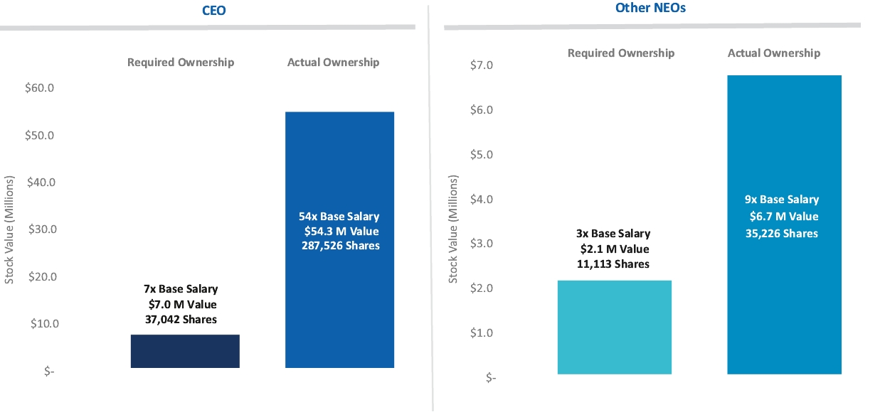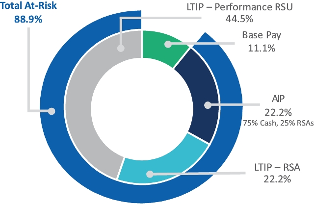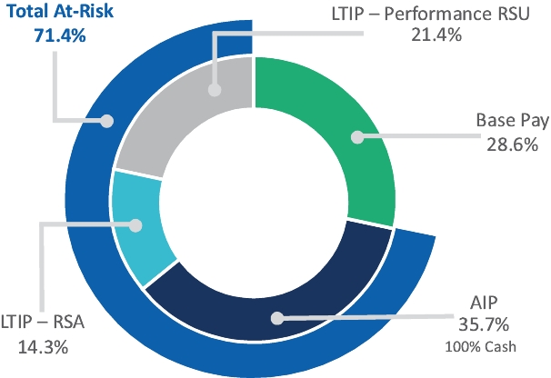 Long-Term Incentive Pay (“LTIP”) Program | Long-term equity incentives in the form of annual time-based award of restricted stock units (“RSU”) to our Chief Executive Officer (“CEO”) and time-based restricted stock awards (“RSA”) to all other NEOs, and awards of performance-based RSUs (“Performance RSU”) to all NEOs, with multiyear vesting schedules. No changes to LTIP performance measures and form of payout for our CEO in 2024. Target LTIP opportunity for our other NEOs increased from 1.0x base salary in 2023 to 1.25x base salary in 2024. | |||||||