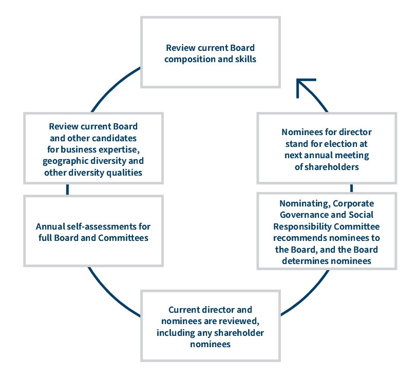![]() | Fall Informed by our summer report, we conduct discussions with shareholders to assess corporate governance and compensation trends and practices that are important to them. Winter Report shareholder feedback from our fall meetings to the Board and use shareholder feedback to enhance our proxy disclosure and make appropriate changes to our governance practices and executive compensation program. Spring Conduct follow-up conversations with our largest shareholders and extend an invitation to our 20 largest non-executive shareholders to discuss important issues that will be considered at our upcoming annual meeting. Summer Prepare a report for the Board that includes a review of voting results and feedback we received from our shareholders during the proxy season. This discussion informs outreach and engagement plans for our meetings with shareholders during the fall. | ||