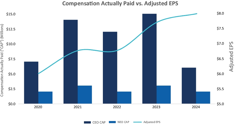 (1) | See Appendix A for the definitions of Adjusted EPS used for financial reporting purposes referred to in this CD&A and the reconciliations of non-GAAP financial measures to the most directly comparable GAAP financial measures, as well as the reasons management believes these non-GAAP financial measures provide useful information to investors. The Compensation Committee did not further adjust the Adjusted EPS financial performance metric defined in Appendix A to determine 2024 AIP. See the section of this CD&A titled “— 2024 Pay Outcomes — 2024 Annual Incentive Pay — Financial Metrics” beginning on page 61 and Appendix B for the definitions of the non-GAAP financial measures, including the description of the further adjustment to Adjusted EBITDA, for determining 2024 AIP of our NEOs and the reconciliations of such non-GAAP financial measures to the most directly comparable GAAP financial measures. |