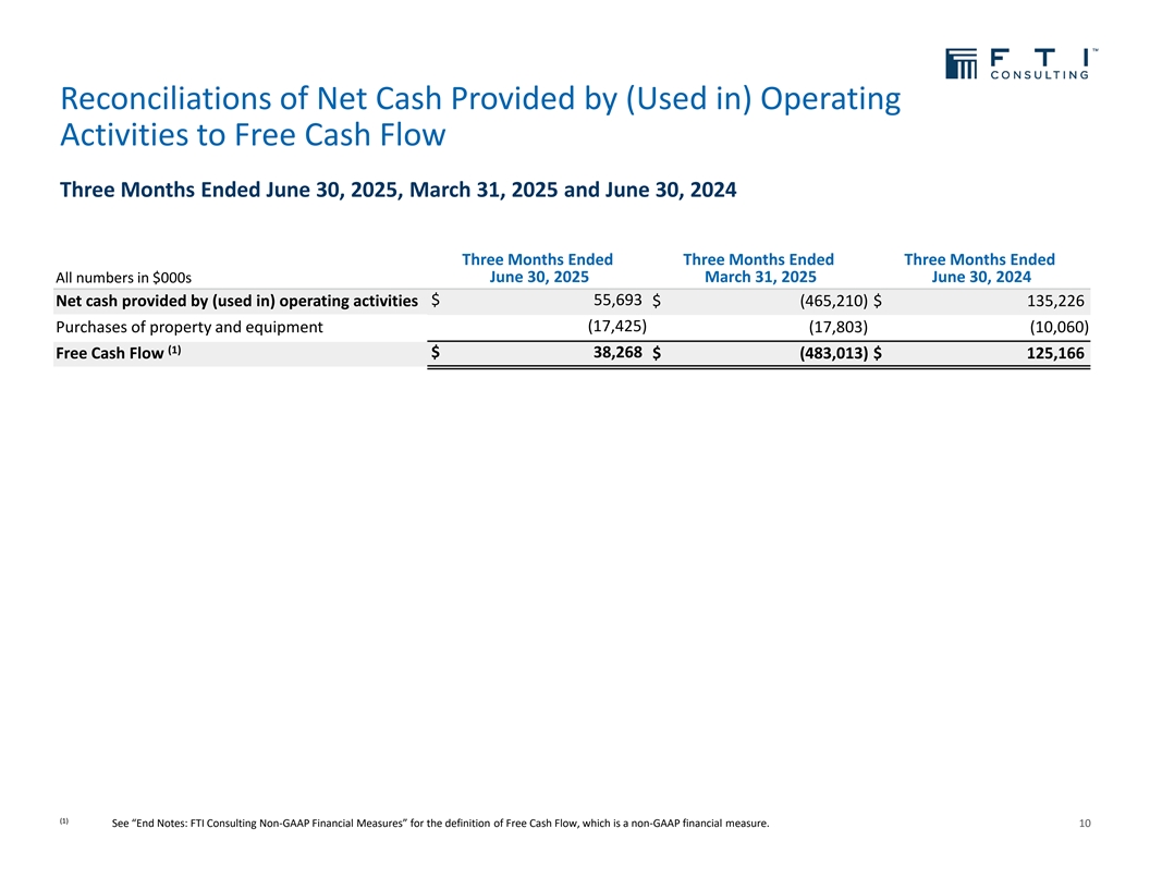 Reconciliations of Net Cash Provided by (Used in) Operating Activities to Free Cash Flow Three Months Ended June 30, 2025, March 31, 2025 and June 30, 2024 Three Months Ended Three Months Ended Three Months Ended June 30, 2025 March 31, 2025 June 30, 2024 All numbers in $000s $ 55,693 Net cash provided by (used in) operating activities $ (465,210) $ 135,226 (17,425) Purchases of property and equipment (17,803) (10,060) (1) $ 38,268 Free Cash Flow $ (483,013) $ 125,166 (1) See “End Notes: FTI Consulting Non-GAAP Financial Measures” for the definition of Free Cash Flow, which is a non-GAAP financial measure. 10