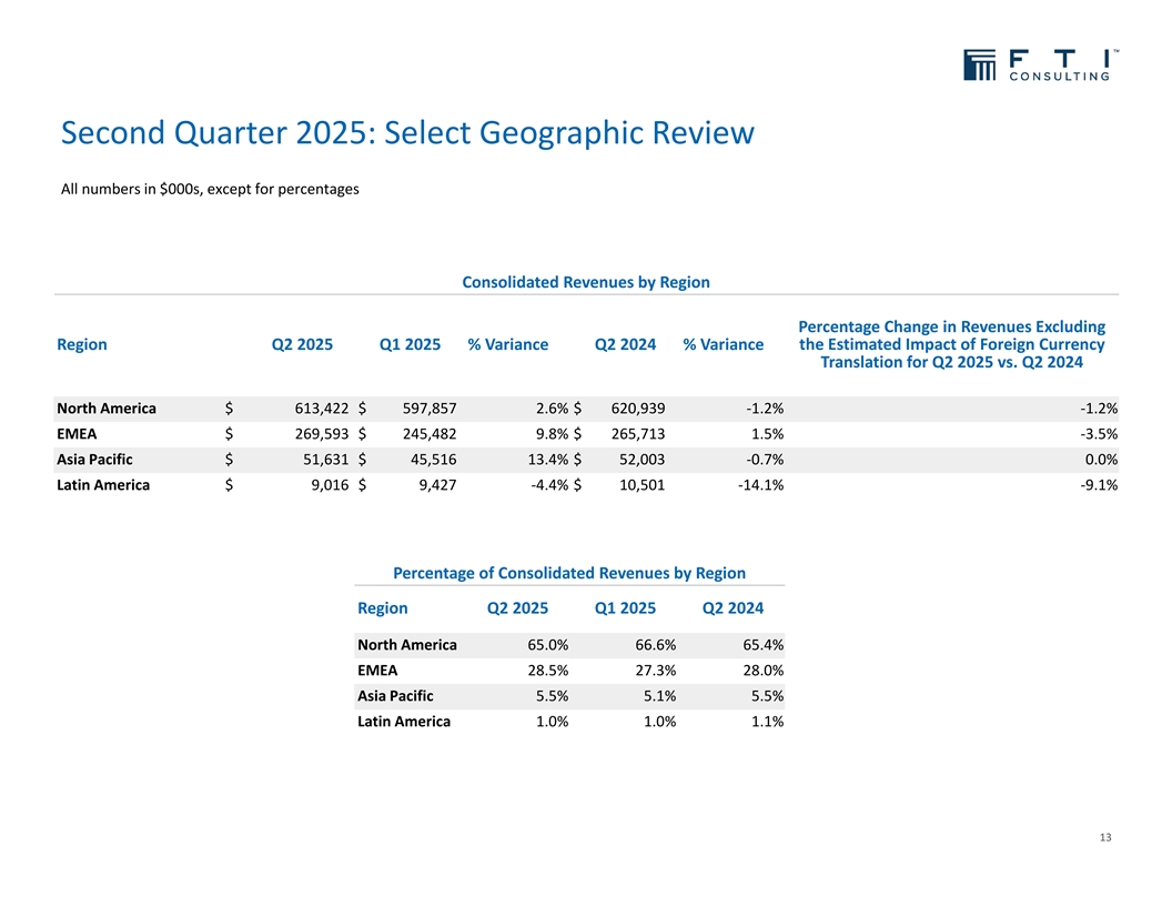 Second Quarter 2025: Select Geographic Review All numbers in $000s, except for percentages Consolidated Revenues by Region Percentage Change in Revenues Excluding the Estimated Impact of Foreign Currency Region Q2 2025 Q1 2025 % Variance Q2 2024 % Variance Translation for Q2 2025 vs. Q2 2024 North America $ 613,422 $ 597,857 2.6% $ 620,939 -1.2% -1.2% EMEA $ 269,593 $ 245,482 9.8% $ 265,713 1.5% -3.5% Asia Pacific $ 51,631 $ 45,516 13.4% $ 52,003 -0.7% 0.0% Latin America $ 9,016 $ 9,427 -4.4% $ 10,501 -14.1% -9.1% Percentage of Consolidated Revenues by Region Region Q2 2025 Q1 2025 Q2 2024 North America 65.0% 66.6% 65.4% EMEA 28.5% 27.3% 28.0% Asia Pacific 5.5% 5.1% 5.5% Latin America 1.0% 1.0% 1.1% 13