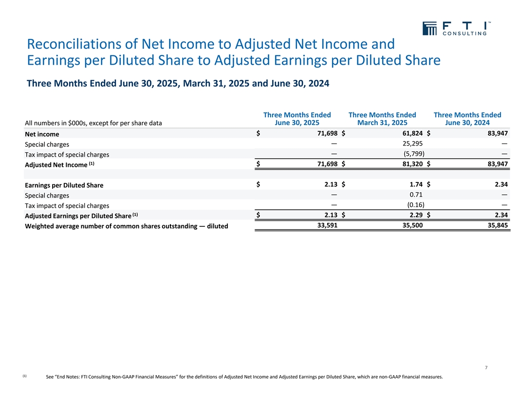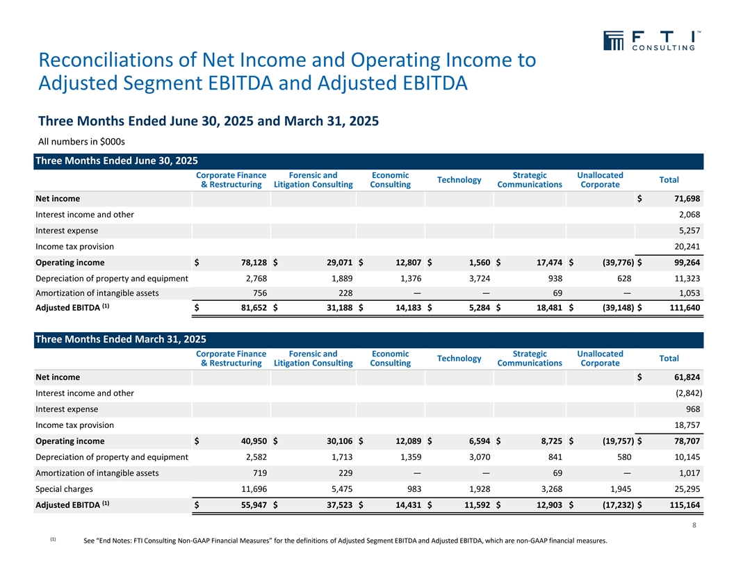 Reconciliations of Net Income to Adjusted Net Income and Earnings per Diluted Share to Adjusted Earnings per Diluted Share Three Months Ended June 30, 2025, March 31, 2025 and June 30, 2024 Three Months Ended Three Months Ended Three Months Ended All numbers in $000s, except for per share data June 30, 2025 March 31, 2025 June 30, 2024 $ 71,698 $ 61,824 $ 83,947 Net income — 25,295 — Special charges — (5,799) — Tax impact of special charges (1) $ 71,698 $ 81,320 $ 83,947 Adjusted Net Income $ 2.13 $ 1.74 $ 2.34 Earnings per Diluted Share — 0.71 — Special charges — (0.16) — Tax impact of special charges (1) $ 2.13 $ 2.29 $ 2.34 Adjusted Earnings per Diluted Share 33,591 35,500 35,845 Weighted average number of common shares outstanding — diluted 7 (1) See “End Notes: FTI Consulting Non-GAAP Financial Measures” for the definitions of Adjusted Net Income and Adjusted Earnings per Diluted Share, which are non-GAAP financial measures.