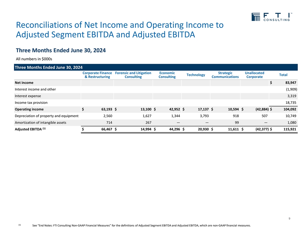Reconciliations of Net Income and Operating Income to Adjusted Segment EBITDA and Adjusted EBITDA Three Months Ended June 30, 2025 and March 31, 2025 All numbers in $000s Three Months Ended June 30, 2025 Corporate Finance Forensic and Economic Strategic Unallocated Technology Total & Restructuring Litigation Consulting Consulting Communications Corporate Net income $ 71,698 Interest income and other 2,068 Interest expense 5,257 Income tax provision 20,241 Operating income $ 78,128 $ 29,071 $ 12,807 $ 1,560 $ 17,474 $ (39,776) $ 99,264 Depreciation of property and equipment 2,768 1,889 1,376 3,724 938 628 11,323 Amortization of intangible assets 756 228 — — 69 — 1,053 (1) Adjusted EBITDA $ 81,652 $ 31,188 $ 14,183 $ 5,284 $ 18,481 $ (39,148) $ 111,640 Three Months Ended March 31, 2025 Corporate Finance Forensic and Economic Strategic Unallocated Technology Total & Restructuring Litigation Consulting Consulting Communications Corporate Net income $ 61,824 Interest income and other (2,842) Interest expense 968 Income tax provision 18,757 Operating income $ 40,950 $ 30,106 $ 12,089 $ 6,594 $ 8,725 $ (19,757) $ 78,707 Depreciation of property and equipment 2,582 1,713 1,359 3,070 841 580 10,145 Amortization of intangible assets 719 229 — — 69 — 1,017 Special charges 11,696 5,475 983 1,928 3,268 1,945 25,295 (1) Adjusted EBITDA $ 55,947 $ 37,523 $ 14,431 $ 11,592 $ 12,903 $ (17,232) $ 115,164 8 (1) See “End Notes: FTI Consulting Non-GAAP Financial Measures” for the definitions of Adjusted Segment EBITDA and Adjusted EBITDA, which are non-GAAP financial measures.