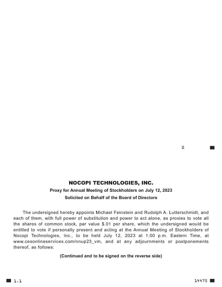 The 2023 Annual Meeting of Stockholders (the “2023 Annual Meeting”) of Nocopi Technologies, Inc. (the “Company” or “Nocopi”) will be held online via a live webcast, at 1:00 p.m., Eastern Time, on Wednesday, July 12, 2023, at www.cesonlineservices.com/nnup23_vm. There is no physical location for the 2023 Annual Meeting. To participate in the 2023 Annual Meeting, you must pre-register at www.cesonlineservices.com/nnup23_vm, by 1:00 p.m. Eastern Time, on Tuesday, July 11, 2023. The formal notice of the 2023 Annual Meeting appears on the following page.