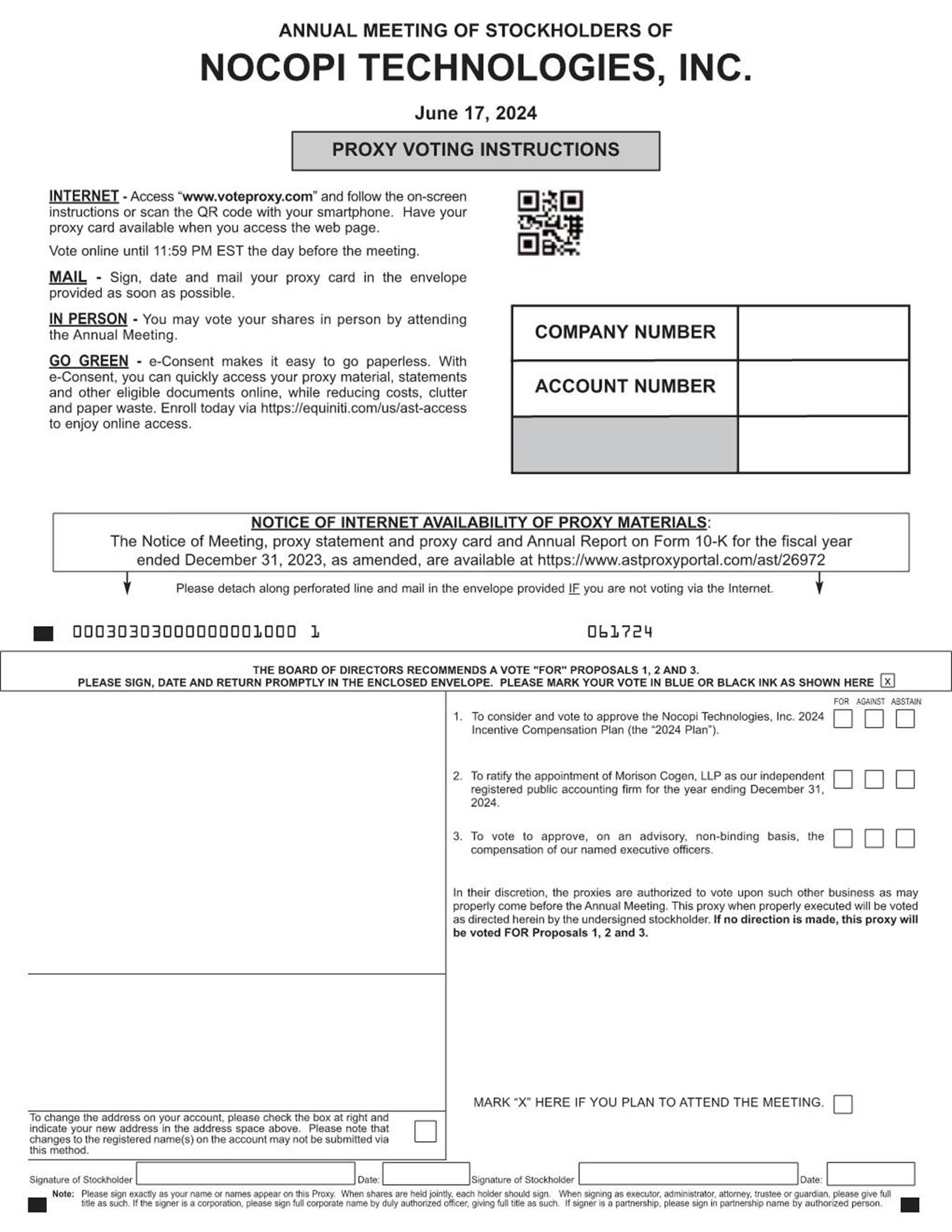 The 2024 Annual Meeting of Stockholders (the “2024 Annual Meeting”) of Nocopi Technologies, Inc. (the “Company” or “Nocopi”) will be held online via a live webcast, at 9:00 a.m. Eastern Time, on Monday, June 17, 2024, at www.cesonlineservices.com/nnup24_vm. There is no physical location for the 2024 Annual Meeting. To participate in the 2024 Annual Meeting, you must pre-register at www.cesonlineservices.com/nnup24_vm, by 9:00 a.m. Eastern Time, on Sunday, June 16, 2024. The formal notice of the 2024 Annual Meeting appears on the following page.