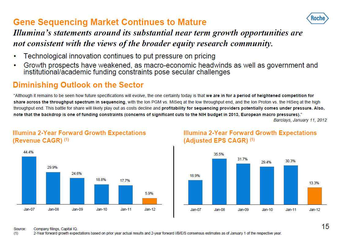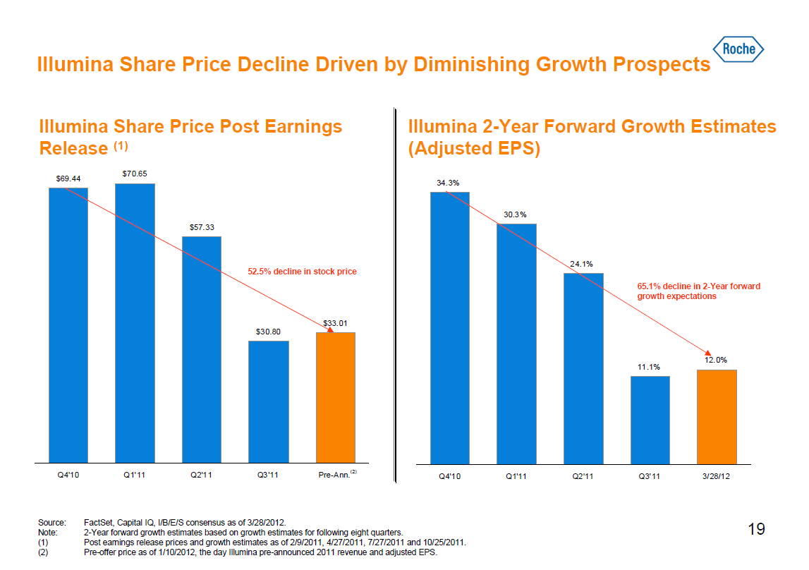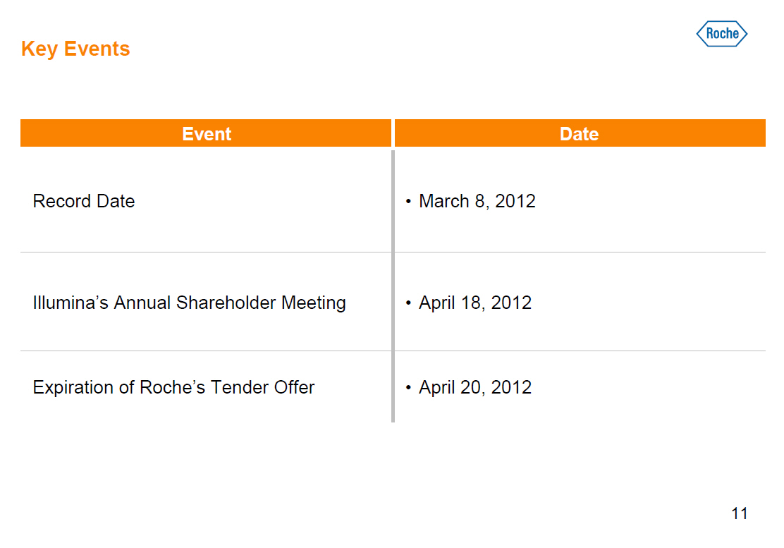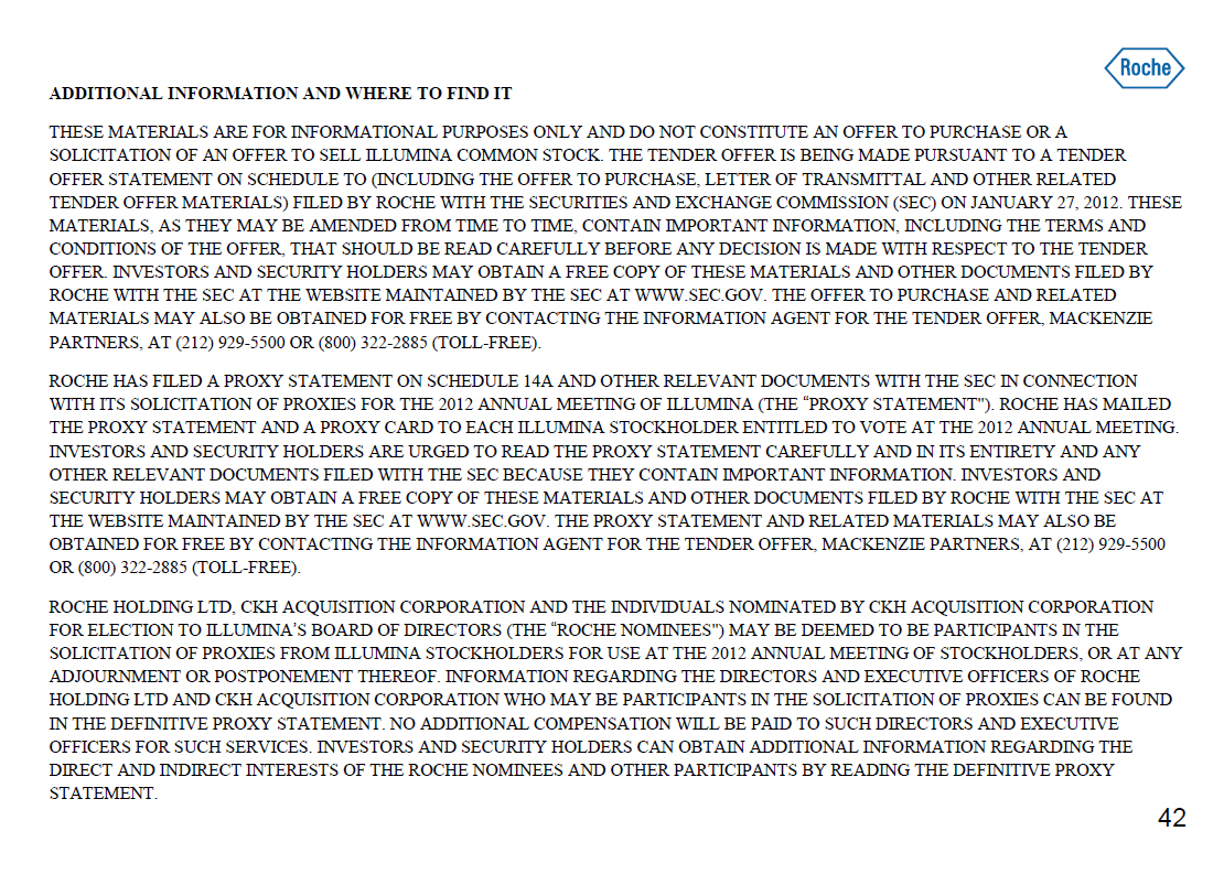 ADDITIONAL INFORMATION AND WHERE TO FIND IT THESE MATERIALS ARE FOR INFORMATIONAL PURPOSES ONLY AND DO NOT CONSTITUTE AN OFFER TO PURCHASE OR A SOLICITATION OF AN OFFER TO SELL ILLUMINA COMMON STOCK. THE TENDER OFFER IS BEING MADE PURSUANT TO A TENDER OFFER STATEMENT ON SCHEDULE TO (INCLUDING THE OFFER TO PURCHASE, LETTER OF TRANSMITTAL AND OTHER RELATED TENDER OFFER MATERIALS) FILED BY ROCHE WITH THE SECURITIES AND EXCHANGE COMMISSION (SEC) ON JANUARY 27, 2012. THESE MATERIALS, AS THEY MAY BE AMENDED FROM TIME TO TIME, CONTAIN IMPORTANT INFORMATION, INCLUDING THE TERMS AND CONDITIONS OF THE OFFER, THAT SHOULD BE READ CAREFULLY BEFORE ANY DECISION IS MADE WITH RESPECT TO THE TENDER OFFER. INVESTORS AND SECURITY HOLDERS MAY OBTAIN A FREE COPY OF THESE MATERIALS AND OTHER DOCUMENTS FILED BY ROCHE WITH THE SEC AT THE WEBSITE MAINTAINED BY THE SEC AT WWW.SEC.GOV. THE OFFER TO PURCHASE AND RELATED MATERIALS MAY ALSO BE OBTAINED FOR FREE BY CONTACTING THE INFORMATION AGENT FOR THE TENDER OFFER, MACKENZIE PARTNERS, AT (212) 929-5500 OR (800) 322-2885 (TOLL-FREE). ROCHE HAS FILED A PROXY STATEMENT ON SCHEDULE 14A AND OTHER RELEVANT DOCUMENTS WITH THE SEC IN CONNECTION WITH ITS SOLICITATION OF PROXIES FOR THE 2012 ANNUAL MEETING OF ILLUMINA (THE "PROXY STATEMENT"). ROCHE HAS MAILED THE PROXY STATEMENT AND A PROXY CARD TO EACH ILLUMINA STOCKHOLDER ENTITLED TO VOTE AT THE 2012 ANNUAL MEETING. INVESTORS AND SECURITY HOLDERS ARE URGED TO READ THE PROXY STATEMENT CAREFULLY AND IN ITS ENTIRETY AND ANY OTHER RELEVANT DOCUMENTS FILED WITH THE SEC BECAUSE THEY CONTAIN IMPORTANT INFORMATION. INVESTORS AND SECURITY HOLDERS MAY OBTAIN A FREE COPY OF THESE MATERIALS AND OTHER DOCUMENTS FILED BY ROCHE WITH THE SEC AT THE WEBSITE MAINTAINED BY THE SEC AT WWW.SEC.GOV. THE PROXY STATEMENT AND RELATED MATERIALS MAY ALSO BE OBTAINED FOR FREE BY CONTACTING THE INFORMATION AGENT FOR THE TENDER OFFER, MACKENZIE PARTNERS, AT (212) 929-5500 OR (800) 322-2885 (TOLL-FREE). ROCHE HOLDING LTD, CKH ACQUISITION CORPORATION AND THE INDIVIDUALS NOMINATED BY CKH ACQUISITION CORPORATION FOR ELECTION TO ILLUMINA'S BOARD OF DIRECTORS (THE "ROCHE NOMINEES") MAY BE DEEMED TO BE PARTICIPANTS IN THE SOLICITATION OF PROXIES FROM ILLUMINA STOCKHOLDERS FOR USE AT THE 2012 ANNUAL MEETING OF STOCKHOLDERS, OR AT ANY ADJOURNMENT OR POSTPONEMENT THEREOF. INFORMATION REGARDING THE DIRECTORS AND EXECUTIVE OFFICERS OF ROCHE HOLDING LTD AND CKH ACQUISITION CORPORATION WHO MAY BE PARTICIPANTS IN THE SOLICITATION OF PROXIES CAN BE FOUND IN THE DEFINITIVE PROXY STATEMENT. NO ADDITIONAL COMPENSATION WILL BE PAID TO SUCH DIRECTORS AND EXECUTIVE OFFICERS FOR SUCH SERVICES. INVESTORS AND SECURITY HOLDERS CAN OBTAIN ADDITIONAL INFORMATION REGARDING THE DIRECT AND INDIRECT INTERESTS OF THE ROCHE NOMINEES AND OTHER PARTICIPANTS BY READING THE DEFINITIVE PROXY STATEMENT. 42 |