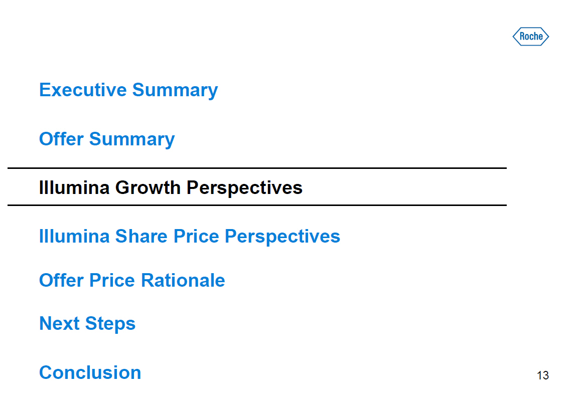 Executive Summary Offer Summary Illumina Growth Perspectives Illumina Share Price Perspectives Offer Price Rationale Next Steps Conclusion 13 |