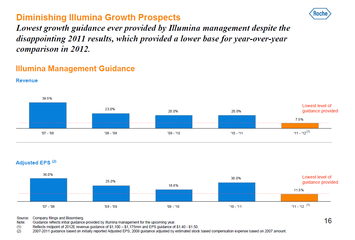 Gene Sequencing Market Continues to Mature Illumina's statements around its substantial near term growth opportunities are not consistent with the views of the broader equity research community. [] Technological innovation continues to put pressure on pricing [] Growth prospects have weakened, as macro-economic headwinds as well as government and institutional/academic funding constraints pose secular challenges Diminishing Outlook on the Sector "Although it remains to be seen how future specifications will evolve, the one certainty today is that we are in for a period of heightened competition for share across the throughput spectrum in sequencing, with the Ion PGM vs. MiSeq at the low throughput end, and the Ion Proton vs. the HiSeq at the high throughput end. This battle for share will likely play out as costs decline and profitability for sequencing providers potentially comes under pressure. Also, note that the backdrop is one of funding constraints (concerns of significant cuts to the NIH budget in 2013, European macro pressures)." Barclays, January 11, 2012 Illumina 2-Year Forward Growth Expectations (Revenue CAGR) (1) 44.4% 29.9% 24.6% 18.8% 17.7% 5.9% Jan-07 Jan-08 Jan-09 Jan-10 Jan-11 Jan-12 Illumina 2-Year Forward Growth Expectations (Adjusted EPS CAGR) (1) 35.5% 31.7% 29.4% 30.3% 18.9% 13.3% Jan-07 Jan-08 Jan-09 Jan-10 Jan-11 Jan-12 Source: Company filings, Capital IQ. (1) 2-Year forward growth expectations based on prior year actual results and 2-year forward I/B/E/S consensus estimates as of January 1 of the respective year. 15 |