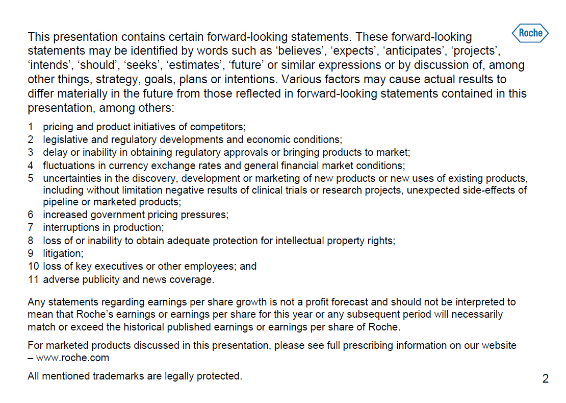 This presentation contains certain forward-looking statements. These forward-looking statements may be identified by words such as 'believes', 'expects', 'anticipates', 'projects', 'intends', 'should', 'seeks', 'estimates', 'future' or similar expressions or by discussion of, among other things, strategy, goals, plans or intentions. Various factors may cause actual results to differ materially in the future from those reflected in forward-looking statements contained in this presentation, among others: 1 pricing and product initiatives of competitors; 2 legislative and regulatory developments and economic conditions; 3 delay or inability in obtaining regulatory approvals or bringing products to market; 4 fluctuations in currency exchange rates and general financial market conditions; 5 uncertainties in the discovery, development or marketing of new products or new uses of existing products, including without limitation negative results of clinical trials or research projects, unexpected side-effects of pipeline or marketed products; 6 increased government pricing pressures; 7 interruptions in production; 8 loss of or inability to obtain adequate protection for intellectual property rights; 9 litigation; 10 loss of key executives or other employees; and 11 adverse publicity and news coverage. Any statements regarding earnings per share growth is not a profit forecast and should not be interpreted to mean that Roche's earnings or earnings per share for this year or any subsequent period will necessarily match or exceed the historical published earnings or earnings per share of Roche. For marketed products discussed in this presentation, please see full prescribing information on our website -- www.roche.com All mentioned trademarks are legally protected. 2 |