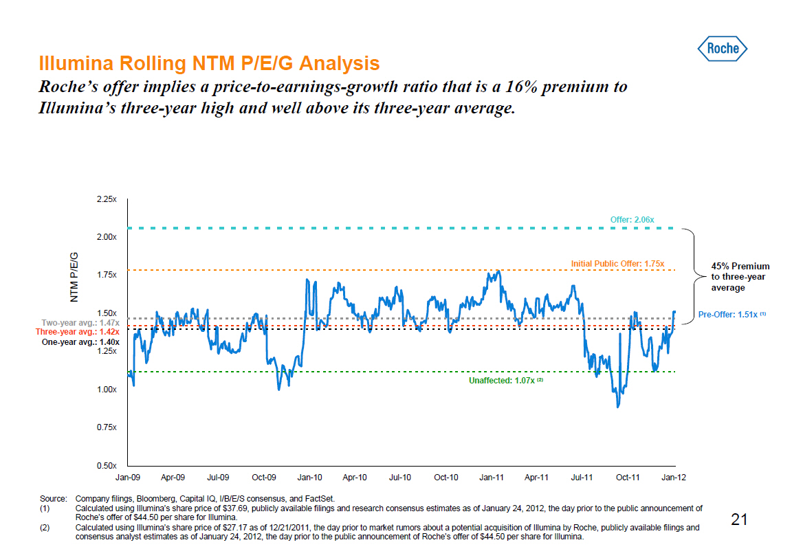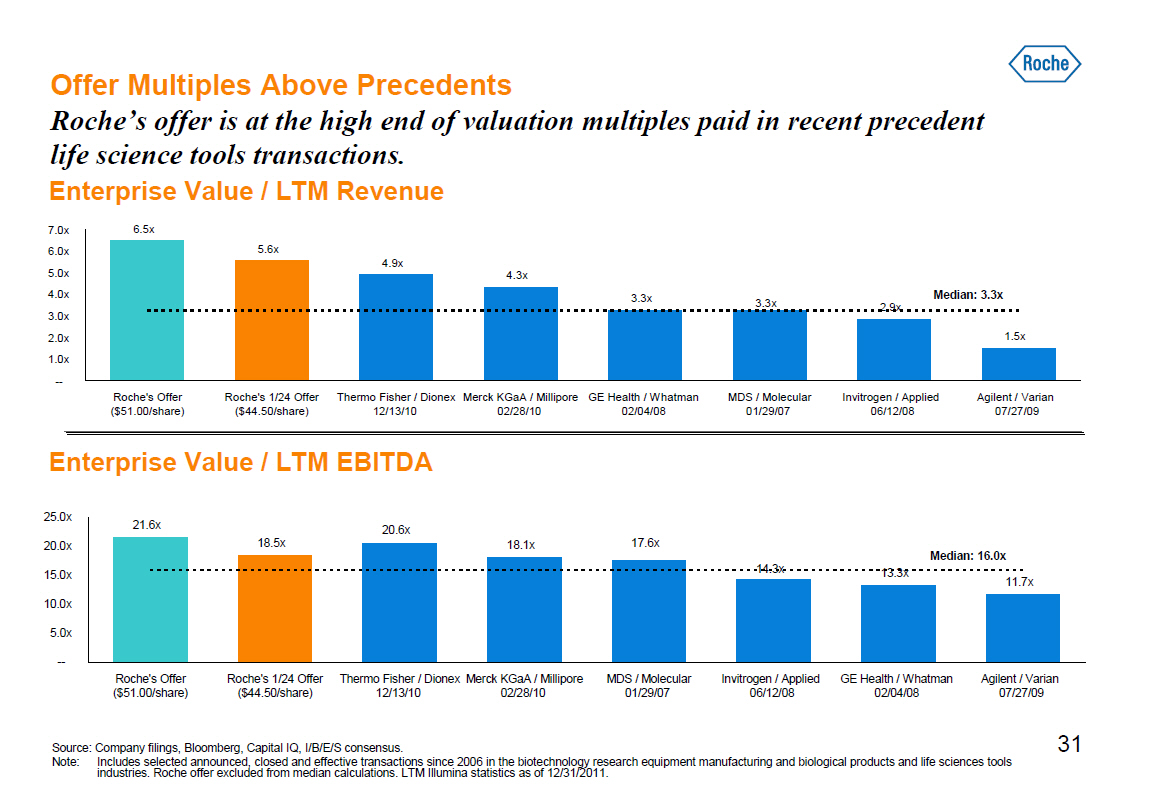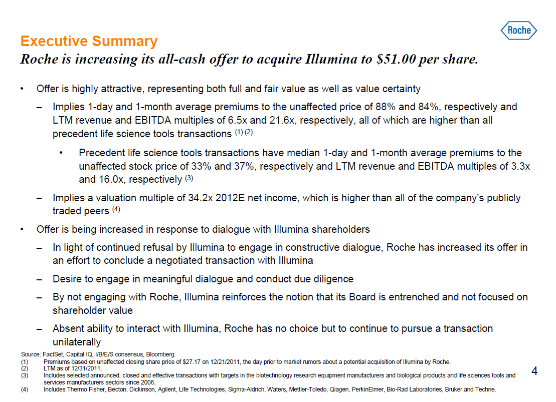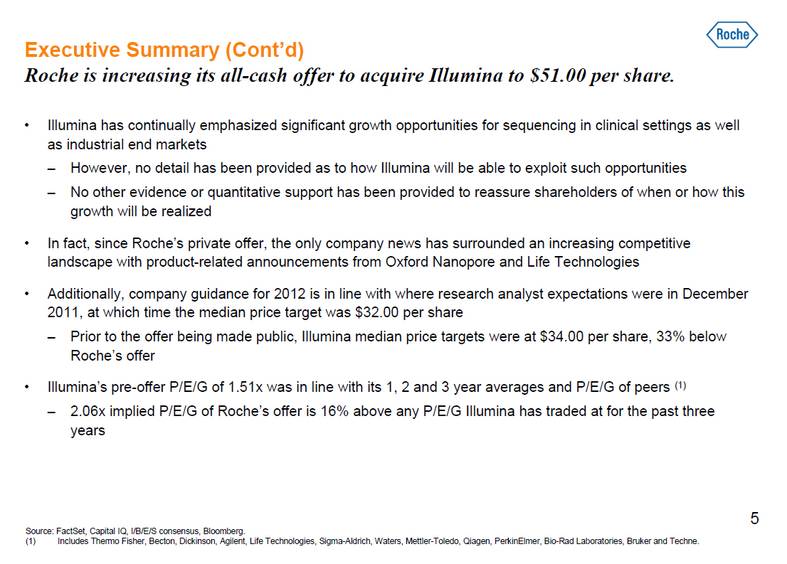 Executive Summary Roche is increasing its all-cash offer to acquire Illumina to $51.00 per share. [] Offer is highly attractive, representing both full and fair value as well as value certainty -- Implies 1-day and 1-month average premiums to the unaffected price of 88% and 84%, respectively and LTM revenue and EBITDA multiples of 6.5x and 21.6x, respectively, all of which are higher than all precedent life science tools transactions (1) (2) [] Precedent life science tools transactions have median 1-day and 1-month average premiums to the unaffected stock price of 33% and 37%, respectively and LTM revenue and EBITDA multiples of 3.3x and 16.0x, respectively (3) -- Implies a valuation multiple of 34.2x 2012E net income, which is higher than all of the company's publicly traded peers (4) [] Offer is being increased in response to dialogue with Illumina shareholders -- In light of continued refusal by Illumina to engage in constructive dialogue, Roche has increased its offer in an effort to conclude a negotiated transaction with Illumina -- Desire to engage in meaningful dialogue and conduct due diligence -- By not engaging with Roche, Illumina reinforces the notion that its Board is entrenched and not focused on shareholder value -- Absent ability to interact with Illumina, Roche has no choice but to continue to pursue a transaction unilaterally Source: FactSet, Capital IQ, I/B/E/S consensus, Bloomberg. (1) Premiums based on unaffected closing share price of $27.17 on 12/21/2011, the day prior to market rumors about a potential acquisition of Illumina by Roche. (2) LTM as of 12/31/2011. 4 (3) Includes selected announced, closed and effective transactions with targets in the biotechnology research equipment manufacturers and biological products and life sciences tools and services manufacturers sectors since 2006. (4) Includes Thermo Fisher, Becton, Dickinson, Agilent, Life Technologies, Sigma-Aldrich, Waters, Mettler-Toledo, Qiagen, PerkinElmer, Bio-Rad Laboratories, Bruker and Techne. |